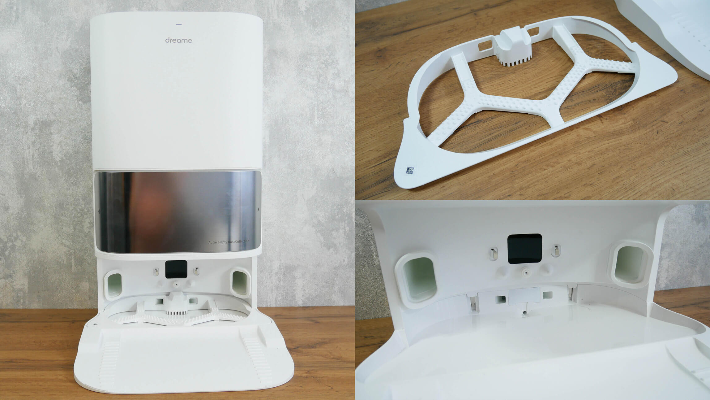 Robotui dulkių siurbliui įlipti skirta platforma. Viduje yra angos dulkių surinktuvo savaiminiam valymui, antgalis roboto rezervuarui papildyti ir skyrius valymo pagalvėlėms skalauti. Platforma nėra visiškai nuimama, kaip jos pirmtako „Dreame Bot W10“ atveju. Nuimamas tik valymo pagalvėlių valymui naudojamas modulis. Tačiau bent jau nuėmus šį modulį, belieka nuvalyti lygų paviršių, o tai patogu ir bus pademonstruota vėliau.
