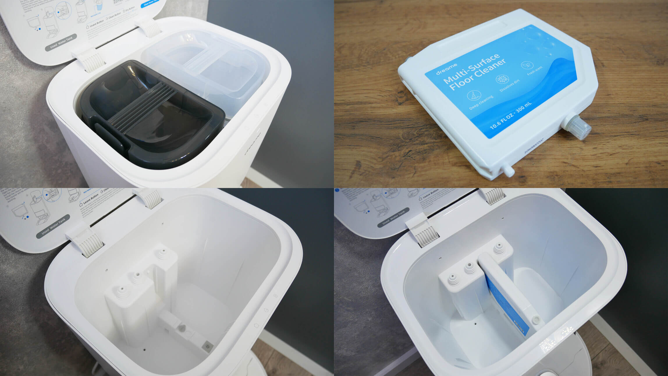 Trys jutikliniai valdymo mygtukai yra šalia viršutinio dangtelio: robotas išeina iš stoties, pradeda valymo procesą ir įjungia servetėlių džiovinimo funkciją. Rezervuarai yra po viršutiniu dangteliu. Pačio dangtelio gale rasite trumpą stoties naudojimo instrukciją. Vėlgi, patogu ir praktiška. Švaraus ir nešvaraus vandens rezervuarai talpina po 2,5 litro. Konstrukcija standartinė. Skysčių dezinfekavimas ultravioletiniais spinduliais nenumatytas, kaip, pavyzdžiui, yra... „Xiaomi Mijia“ savaiminio valymo robotas dulkių siurblys-šluostė „Pro“.