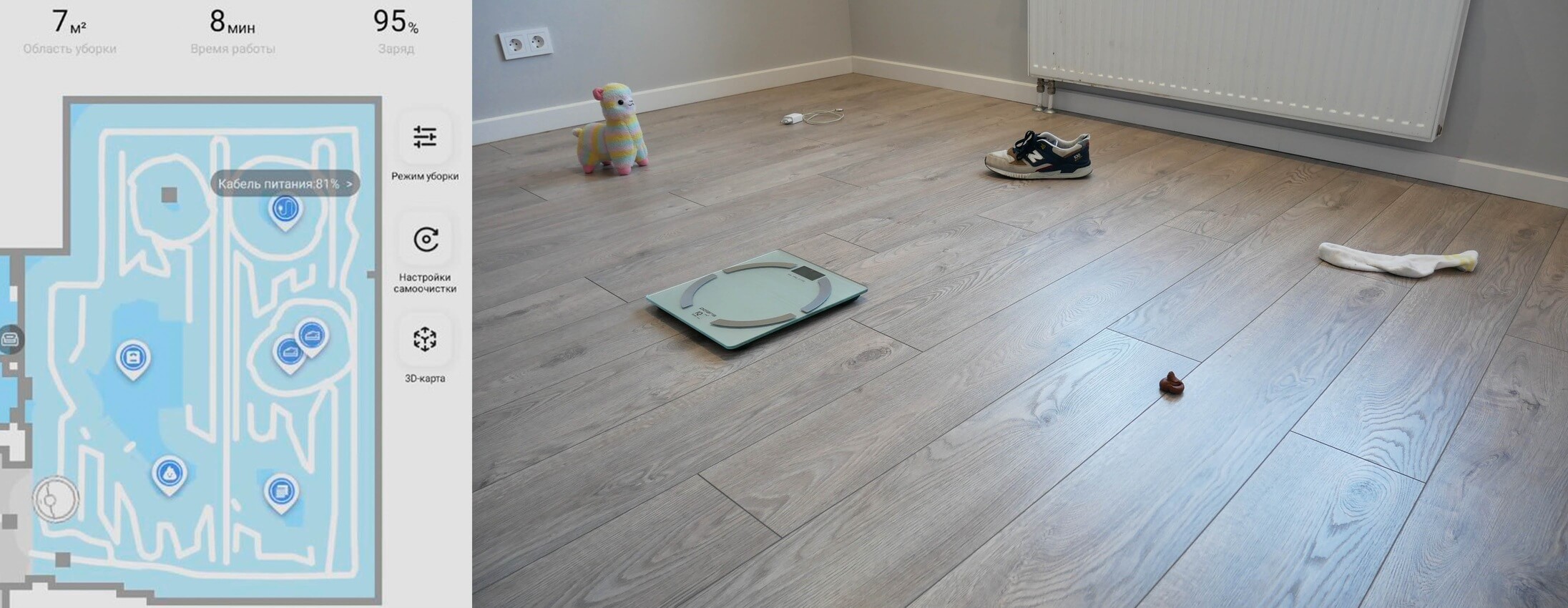 Grindų objektų atpažinimo sistema yra puiki. Robotas dulkių siurblys teisingai atpažino penkis iš šešių objektų, pažymėdamas juos atitinkamomis piktogramomis žemėlapyje. Pliušinis žaislas buvo tiesiog aptiktas kaip kliūtis; jo nebuvo roboto duomenų bazėje, bet tai nėra problema. Svarbiausia, kad „Dreame Bot L10s Ultra“ išvengia laidų, kojinių ir, daugeliui svarbiausia, naminių gyvūnėlių išmatų. Idealiu atveju atpažinti objektai taip pat turėtų būti rodomi kaip nuotraukos, bet dėl kažkokių priežasčių mano atveju jie neįsikrovė. Esu tikras, kad tai bus ištaisyta.