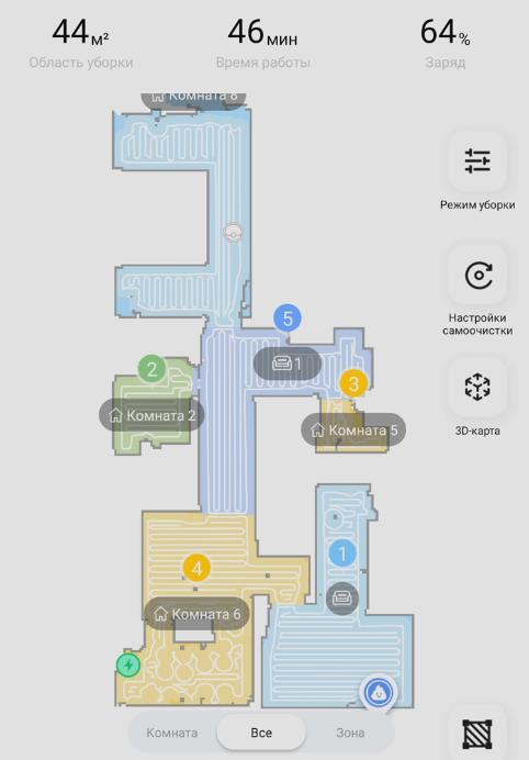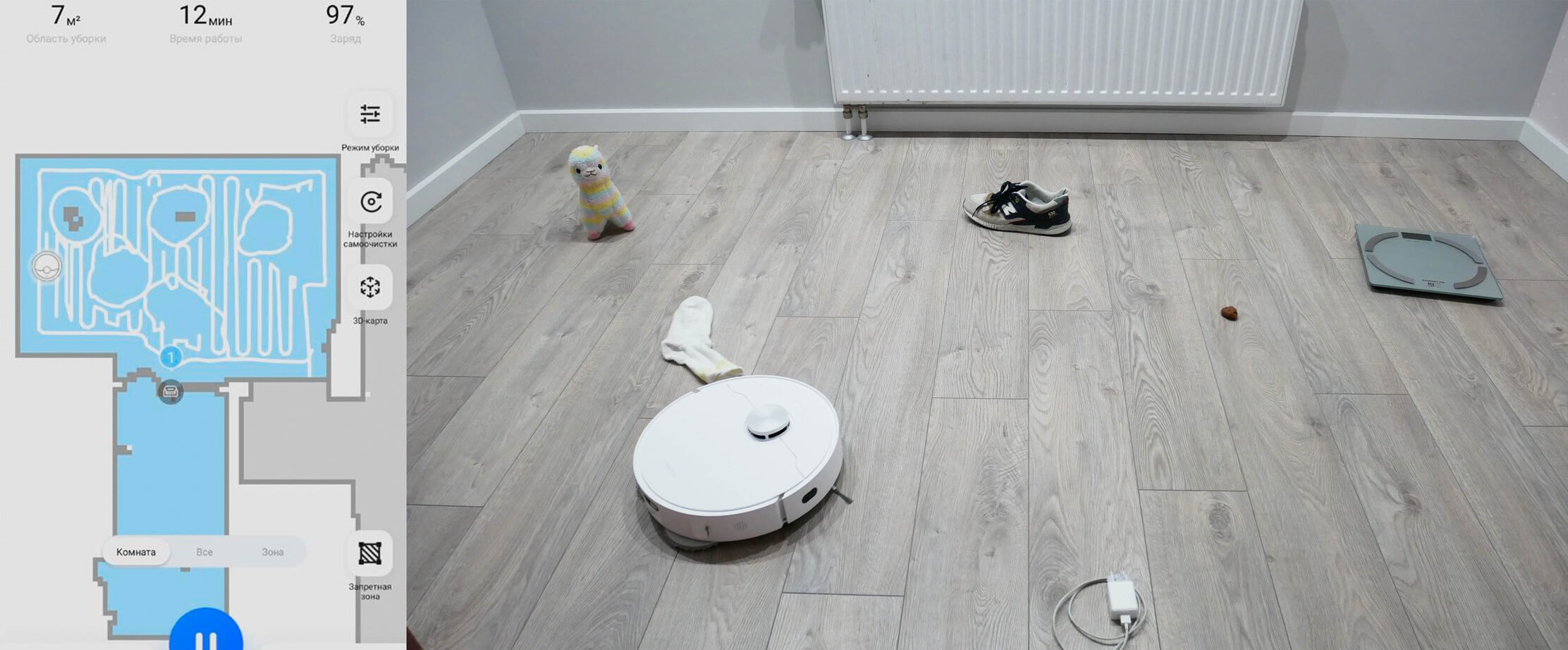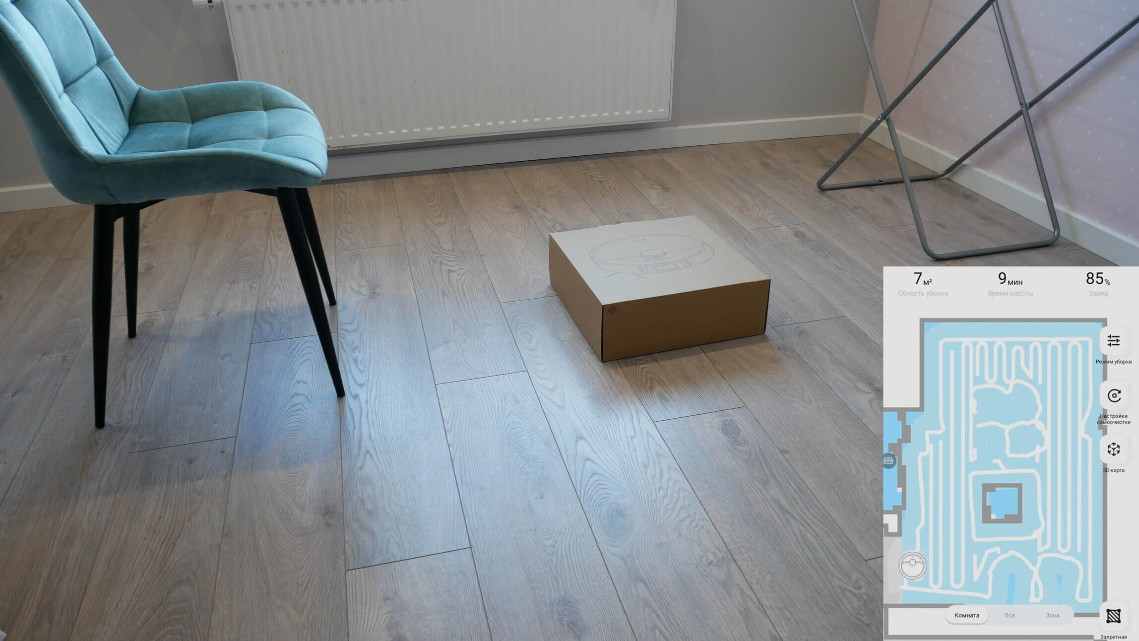 Galiausiai pereikime prie bandymų. Pirmiausia išbandysime „Dreame Bot L10s Ultra“ navigaciją kambaryje su kliūtimis. Robotas dulkių siurblys pirmiausia juda aplink kambario perimetrą, tada išvalo visą prieinamą plotą gyvatės formos trajektorija. Jis aptiko džiovyklės kojeles ir atsargiai jas apėjo. Jis taip pat atskirai apvalė dėžę ir kėdžių kojas, o tada grįžo į stotelę. Bandymas buvo sėkmingas.
