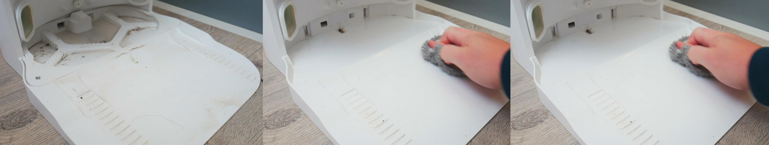 b. Dulkių siurblys arba nepripildė vidinio bako vandens, arba nepučia jo per purkštukus. Tai galima patikrinti valant šlapiuoju būdu, nuėmus šluostes, bet įdėjus pagalvėles, kad robotas manytų, jog yra šluosčių, ir išpuršktų vandenį. Arba už judančio dulkių siurblio lieka vandens lašų, arba jų nėra. Aš jų neturėjau. Tai išsprendžiau pildamas vandenį švirkštu į skylę dulkių siurblio gale, kol vanduo pradėjo tekėti iš purkštukų jo apačioje. Tai kartojosi kelis kartus.