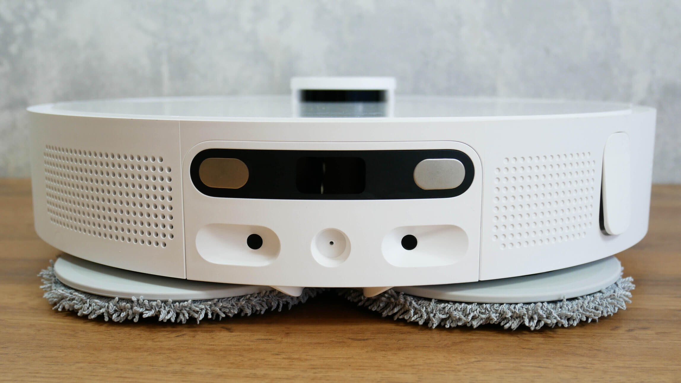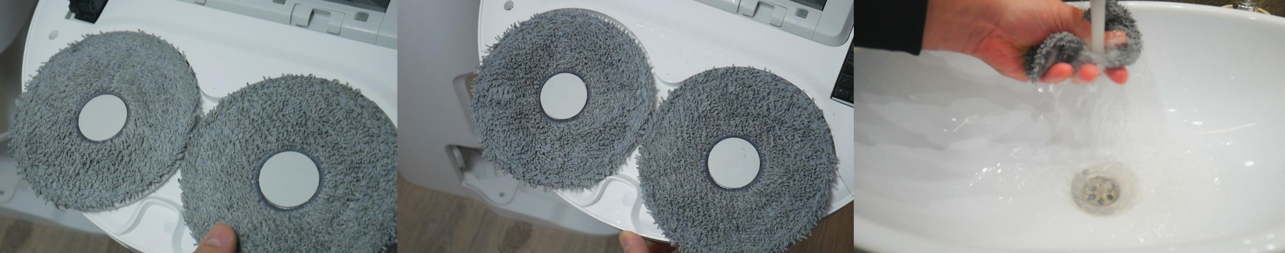 Už šepetėlio bloko yra dvi apvalios, besisukančios mikropluošto šluostės. Jos patogiai pritvirtinamos prie roboto dulkių siurblio korpuso magnetais ir laikomos „Velcro“ lipdukais. Deja, šios šluostės vis dar neperžengia korpuso kraštų, todėl spėju, kad grindų valymo iki pat baldų ir grindjuosčių problema, kaip ir panašių gaminių atveju, lieka neišspręsta.