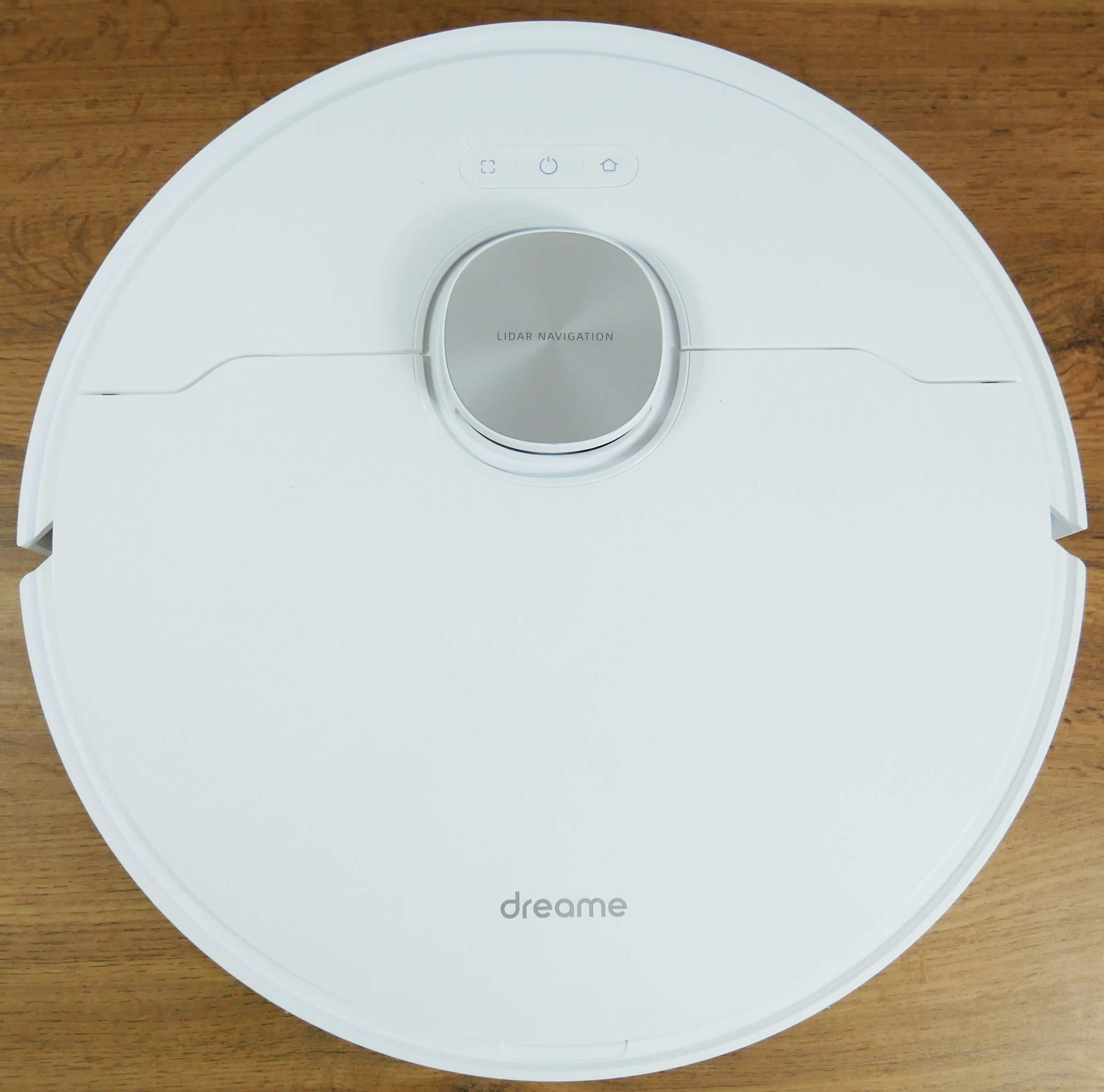 Viršutiniame valdymo skydelyje yra trys mechaninio valdymo mygtukai. Šalia jų sumontuotas lidaro jutiklis su spyruokliniu dangteliu, kad robotas neužstrigtų po baldais.