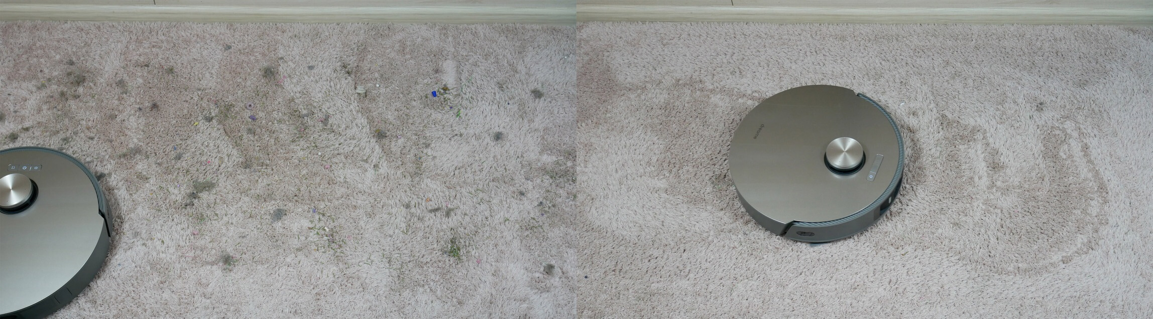 Įvairių rūšių šiukšlių surinkimo nuo laminuotų grindų kokybė yra gera. Kampuose lieka tik šiek tiek šiukšlių, kur apvalūs robotiniai dulkių siurbliai negali šluoti. Taip pat galite pastebėti, kad šiek tiek šiukšlių lieka šalia kampų. Taip yra todėl, kad įjungtas susidūrimo apsaugos režimas. Jei jį išjungsite, robotas visiškai pasislinks į kampą, pašalindamas šią akląją zoną. Šiek tiek plaukų ir kailio surenkama ant centrinio šepečio, bet visos šiukšlės surenkamos dulkių konteineryje.