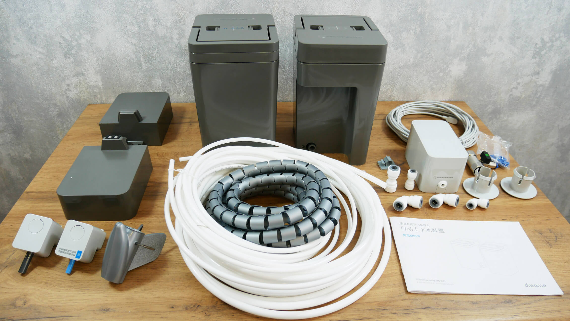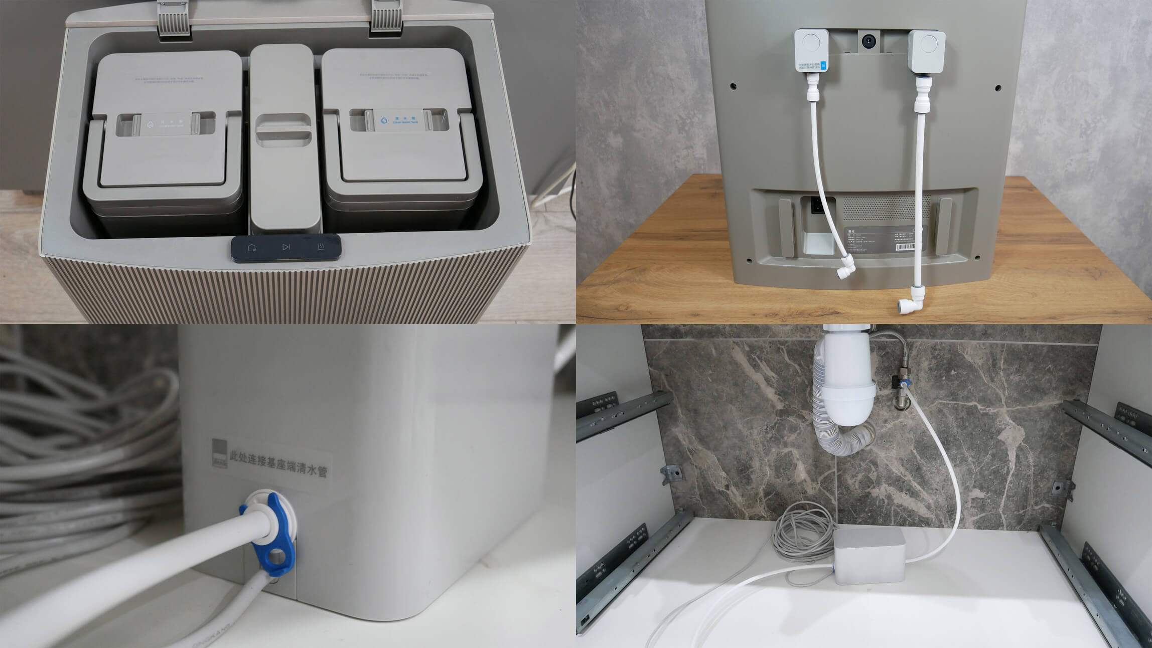 Be to, stotelėje yra jungiamosios detalės, skirtos prijungti prie kanalizacijos ir vandens tiekimo. Jos paslėptos po dangteliu. Kaip prijungti robotą prie kanalizacijos ir vandens tiekimo, paaiškinsiu vėliau šioje apžvalgoje.