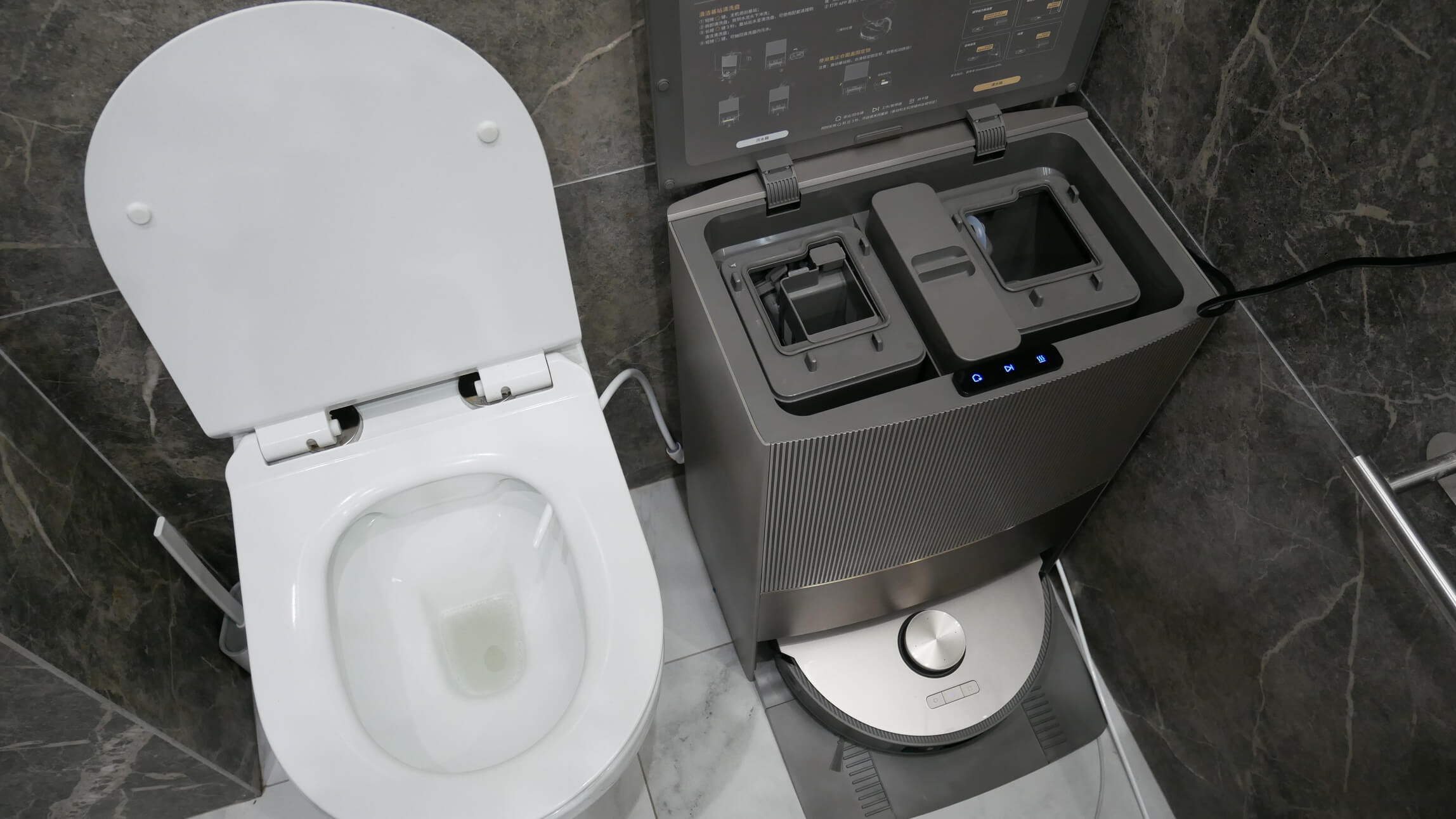 Įjunkite savaiminio valymo funkciją ir štai – vanduo užpildo švaraus vandens rezervuarą ir, išskalavus šluostę, nuteka į tualetą. Laikykite abu dangčius uždarytus, nes sistemai reikalingas dulkių siurblys, todėl turėkite tai omenyje.