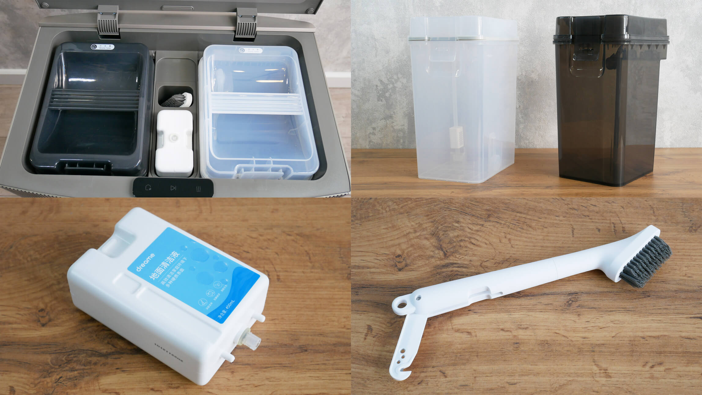 Pagrindinė padidėjusio dydžio priežastis – padidinta vandens bakų talpa. Tai dar vienas protingas sprendimas. Nešvaraus vandens bako talpa padidinta iki 4 litrų, o švaraus vandens – iki 4,5 litro. Švaraus vandens bako viduje įrengtas sidabro pagrindu pagamintas dezinfekavimo modulis. Tai yra privalumas. Valymo įrankis ir ploviklio kasetė patogiai laikomi po dangteliu tarp bakų. Pastarosios talpa padidinta iki 450 ml.