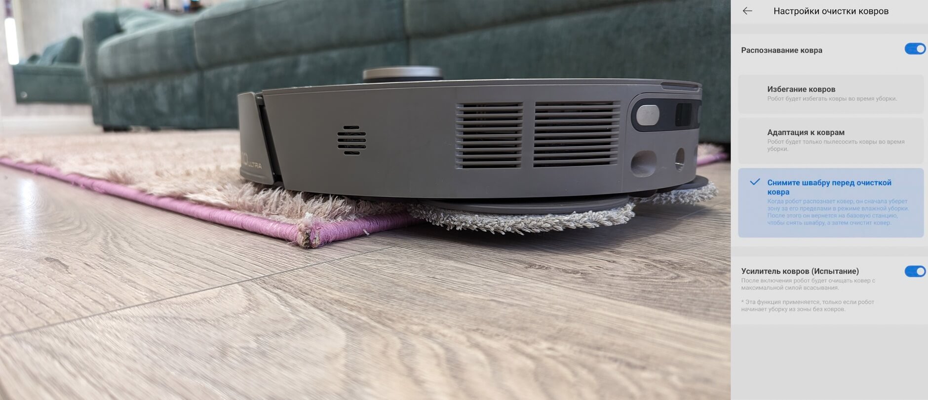 Kalbant apie šlapią kilimų valymą, galite rinktis iš trijų skirtingų roboto veikimo būdų. Pirmasis – automatiškai pakelti valymo pagalvėles, kai jos įeina į kilimus, leisdamas „Dreame Bot X10 Pro“ vienu metu siurbti ir šluostyti grindis, palikdamas kilimus sausus ir švarius. Antrasis variantas – įjungti automatinį kilimų vengimą šlapio valymo režimu. Galiausiai, trečiasis režimas yra unikalus. Robotas dulkių siurblys pirmiausia atlieka sausą ir šlapią kietų grindų valymą, tada įlipa į pagrindą, automatiškai atleidžia valymo pagalvėles ir grįžta prie valymo proceso, išsiurbęs kilimus be valymo pagalvėlių.