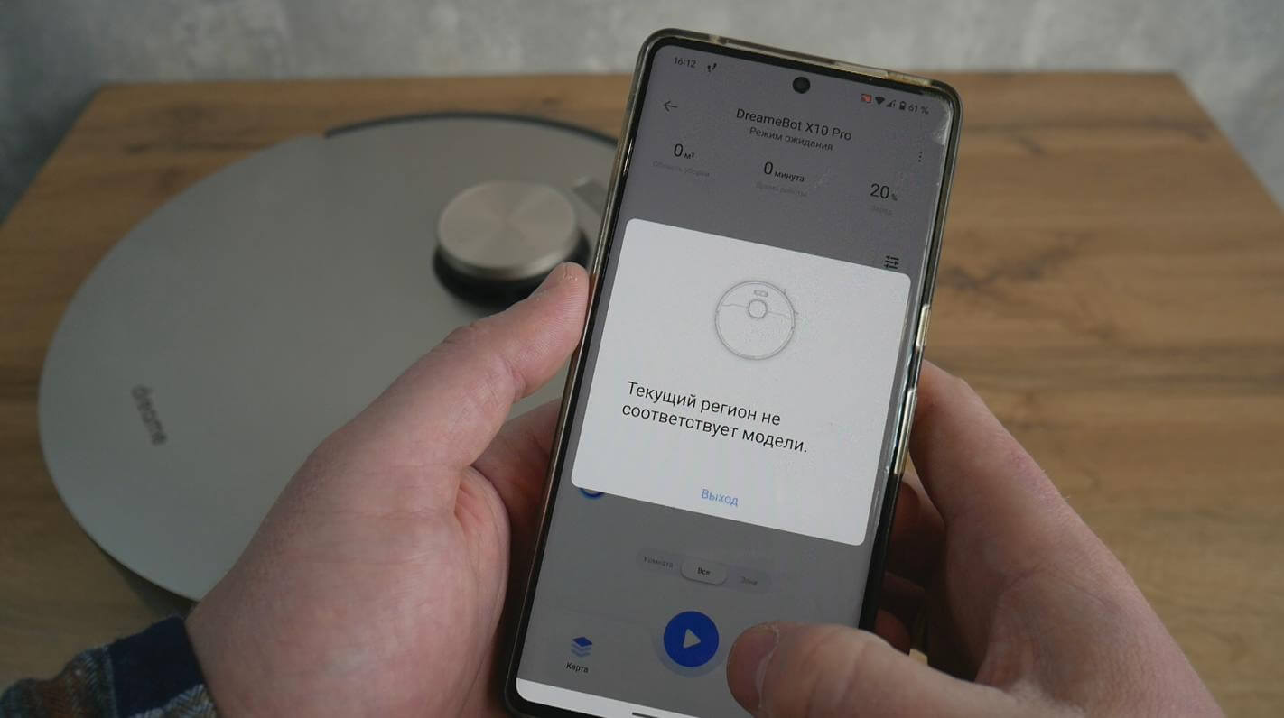 Pereikime prie „Dreame Bot X10 Pro“ funkcijų apžvalgos. Robotą dulkių siurblį galima valdyti tiek per „Mi Home“, tiek per patentuotą „Dreamehome“ programėlę. Kadangi robotas yra kiniškos versijos, abiem atvejais reikia pasirinkti Kinijos regioną. Kaip daugelis iš jūsų tikriausiai žinote, „Dreame“ padidino savo įrenginių saugumą ir įdiegė regiono užraktą. Dėl to visos kiniškos jos robotų versijos, įskaitant „Dreame Bot X10 Pro“, yra blokuojamos už Kinijos ribų. Jie prisijungs prie tinklo be jokių problemų, tačiau jei bandysite pasiekti nustatymų meniu, iš karto pasirodys toks pranešimas: