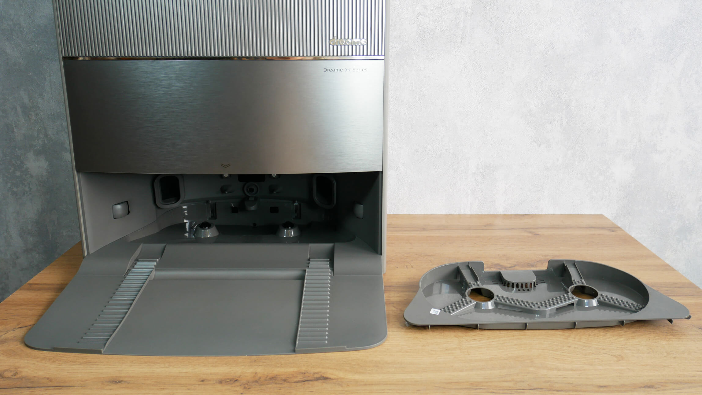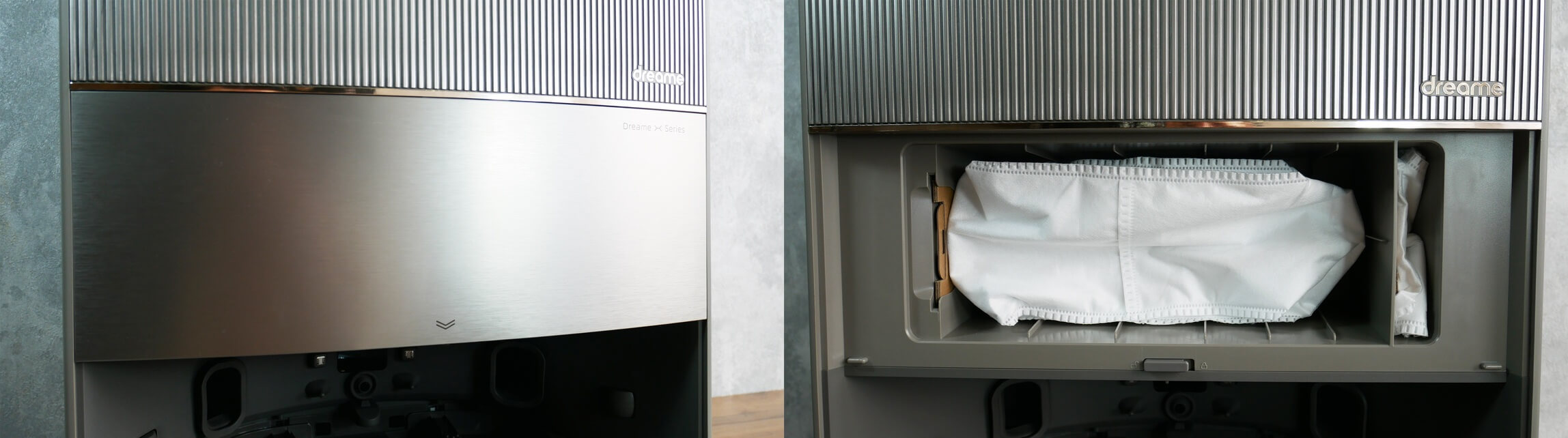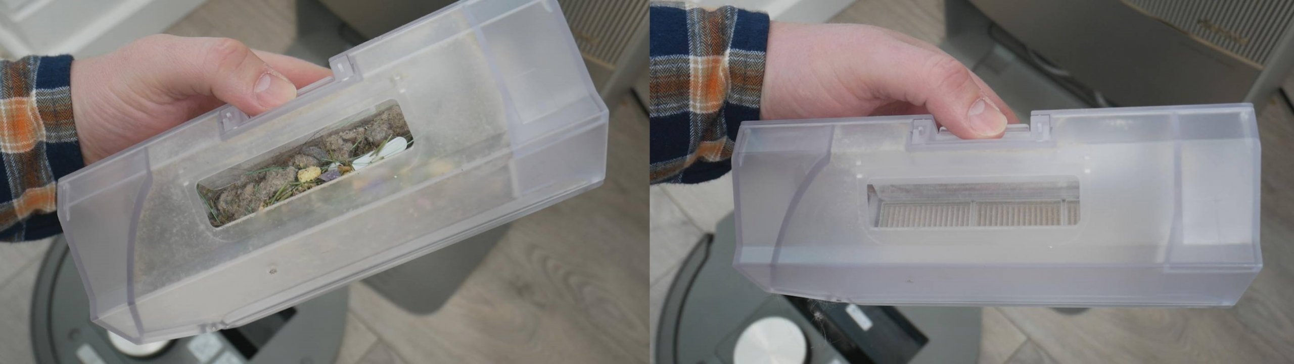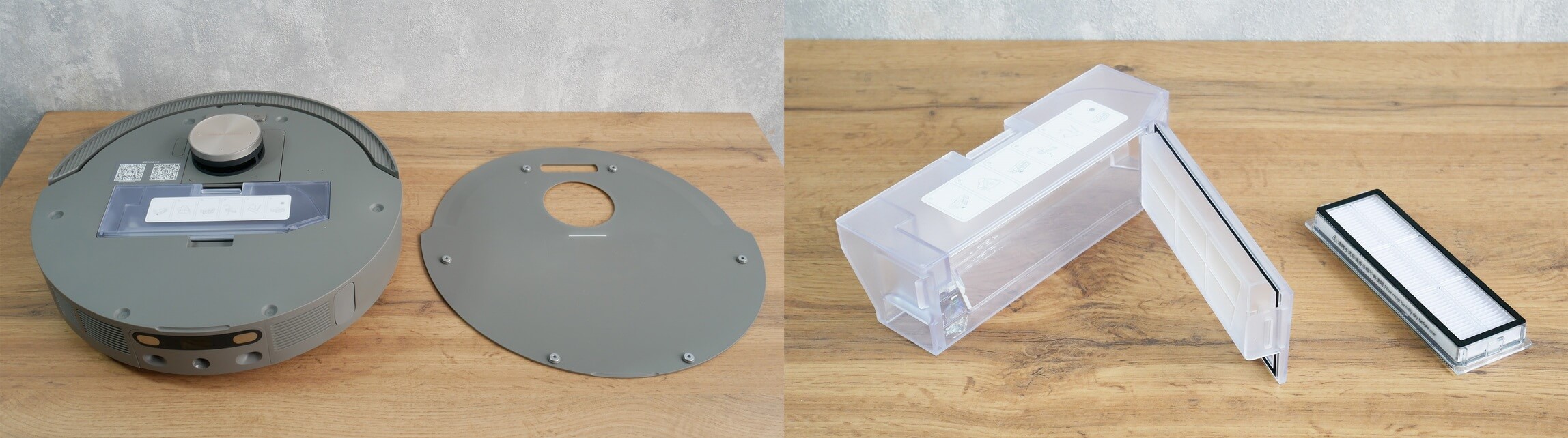 Viršutinis dangtis yra visiškai nuimamas ir laikomas magnetais. Po juo yra 350 ml talpos dulkių surinktuvas. Filtravimo sistemą sudaro tinklelio filtras ir HEPA filtras. Dulkių surinktuvą ir filtrą galima plauti vandeniu. Vandens bakas yra paslėptas roboto viduje ir automatiškai užpildomas stotelėje. Bako talpa yra 80 ml.