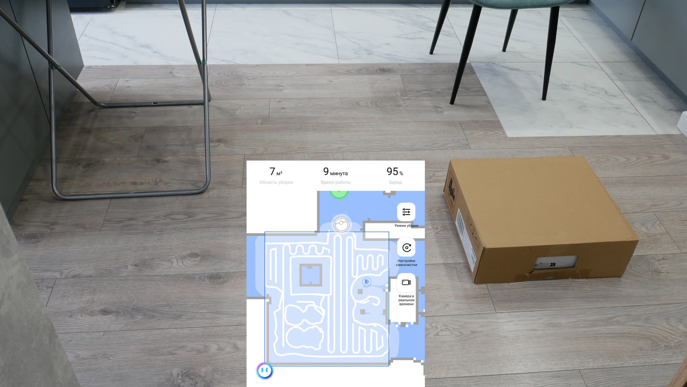 Galiausiai pereikime prie bandymų. Pirmiausia išbandysime „Dreame Bot X10 Pro“ navigaciją kambaryje su kliūtimis. Robotas dulkių siurblys pirmiausia juda aplink kambario perimetrą, tada išvalo visą prieinamą plotą gyvatės formos trajektorija. Jis aptiko džiovyklės kojeles ir atsargiai jas apėjo. Taip pat atskirai apvalė dėžę ir kėdžių kojas, prieš grįždamas į stotelę. Bandymas buvo sėkmingas.