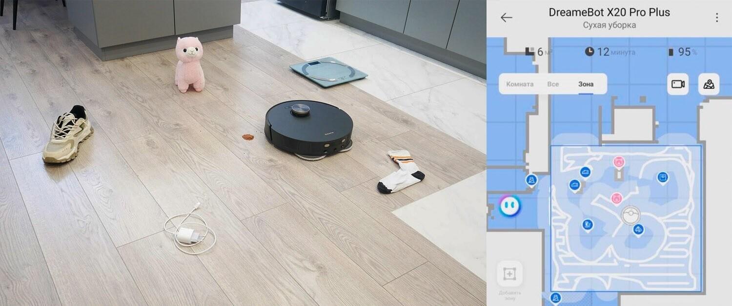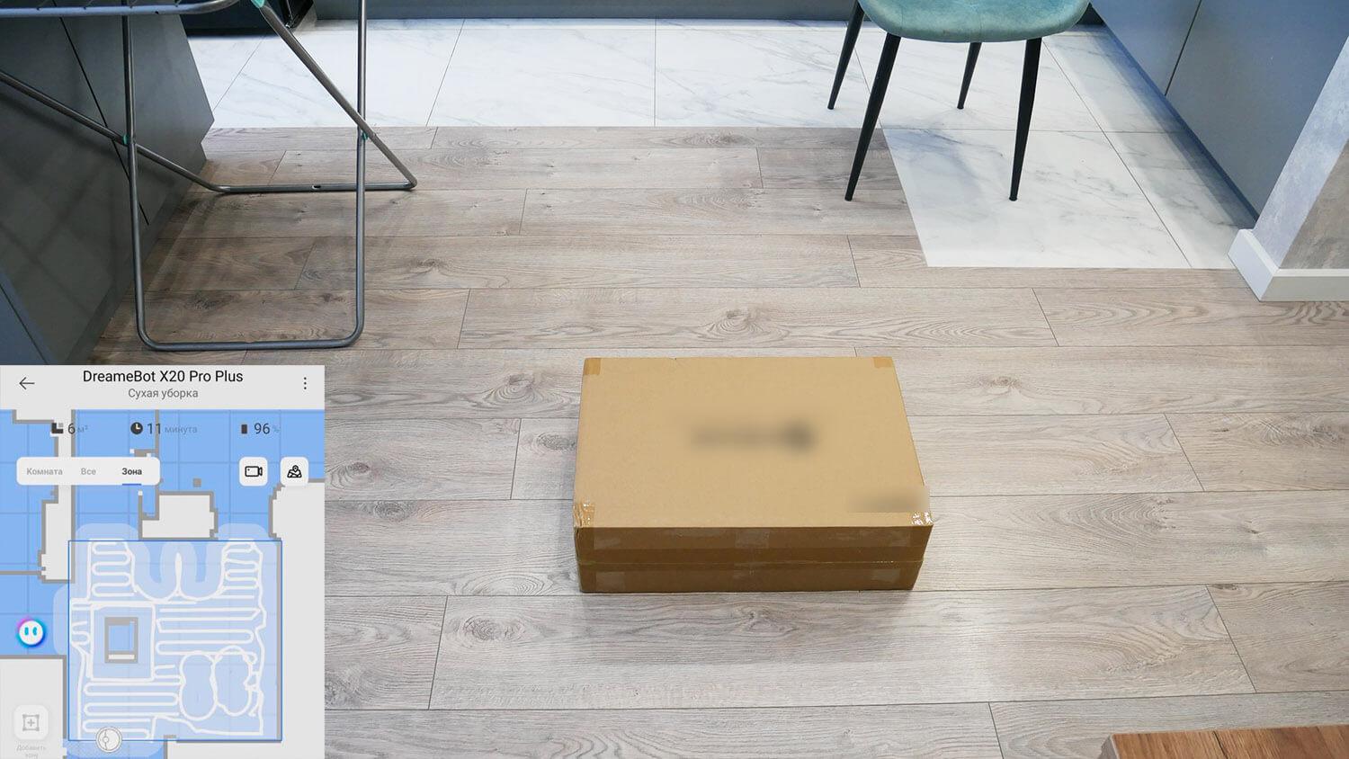 Galiausiai pereikime prie bandymų. Pirmiausia išbandysime „Dreame Bot X20 Pro Plus“ navigaciją kambaryje su kliūtimis. Robotas dulkių siurblys pirmiausia juda aplink kambario perimetrą, tada išvalo visą prieinamą plotą gyvatės formos trajektorija. Jis aptiko džiovyklės kojeles ir atsargiai jas apėjo. Jis taip pat atskirai apvalė dėžę ir kėdžių kojas, o tada grįžo į stotelę. Bandymas buvo sėkmingas.