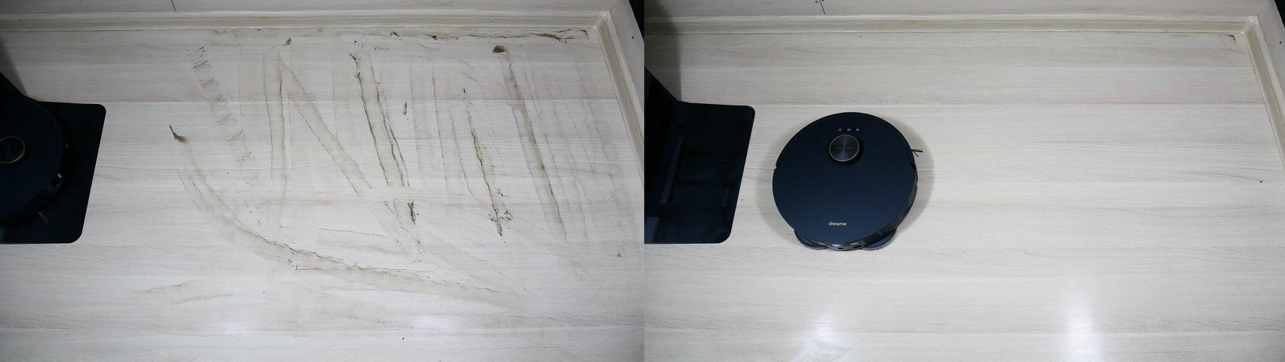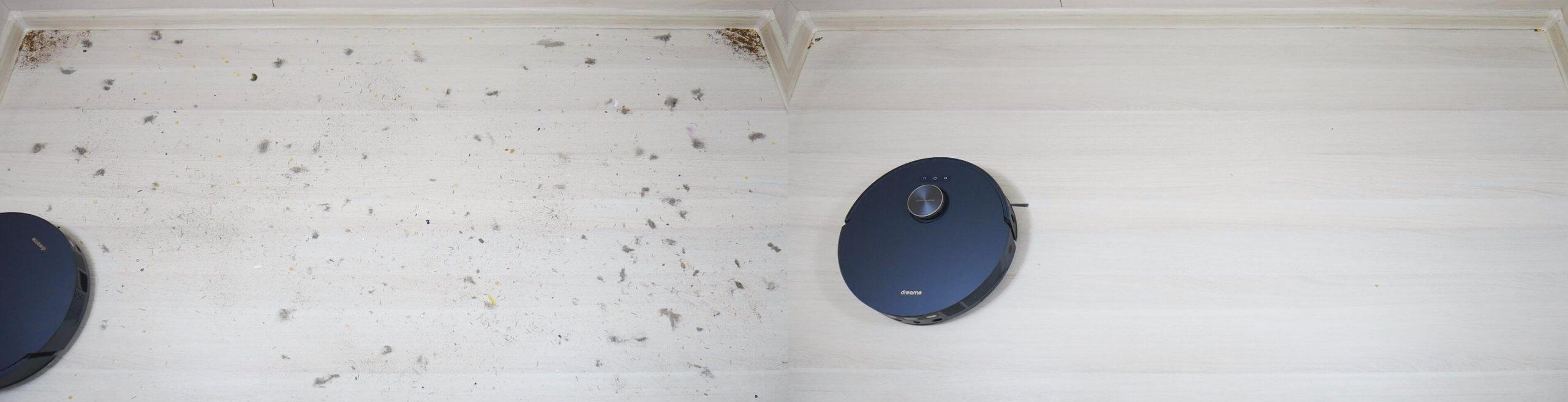 Šis robotas dulkių siurblys puikiai pašalina nešvarumus. Ir kaip matote, „Dreame Bot X20 Pro Plus“ ištraukiama valymo šluostė kruopščiai pašalina nešvarumus net iki grindjuostės. Vis dar yra akloji zona, bet ji yra tik kampuose, kurių nepasiekia apvali valymo šluostė. Nepaisant to, tai geriausias rezultatas iki šiol! Nepalieka jokių dryžių ar nešvarumų žymių; testas sėkmingai išlaikytas!