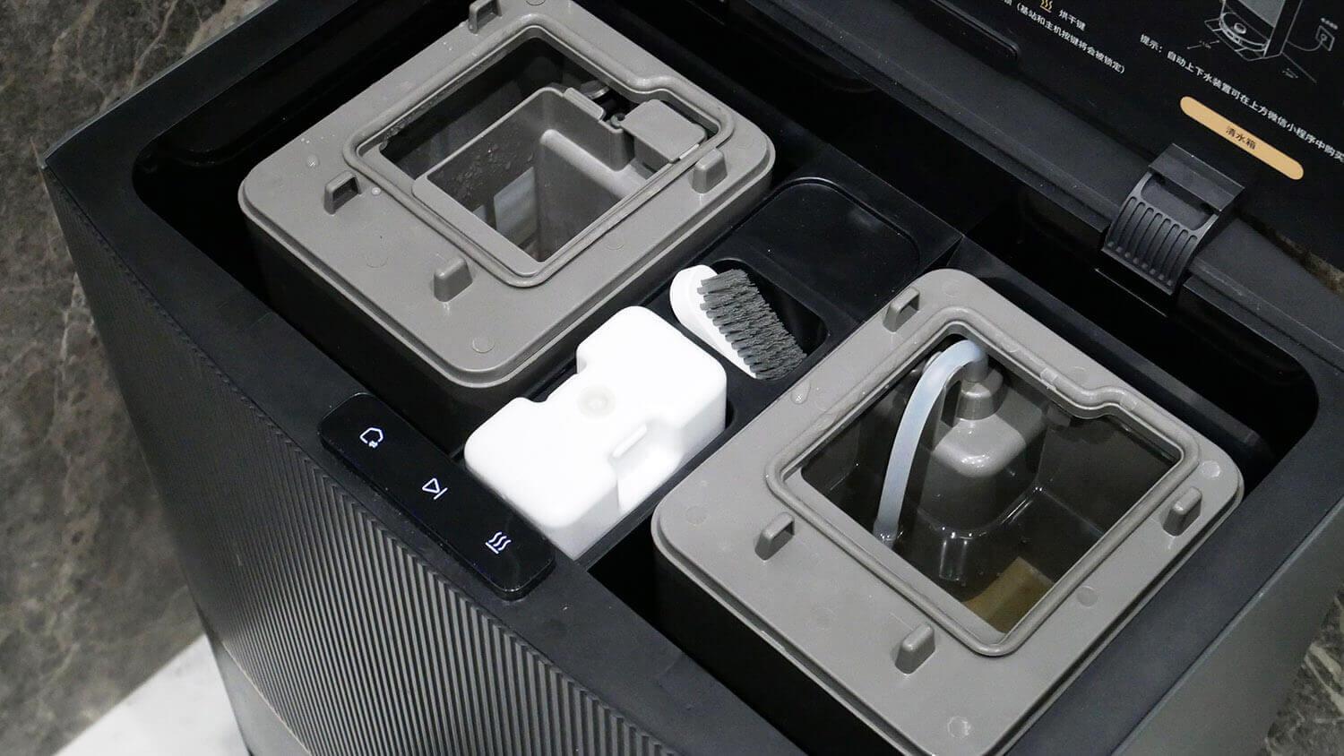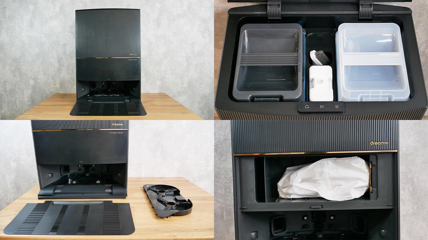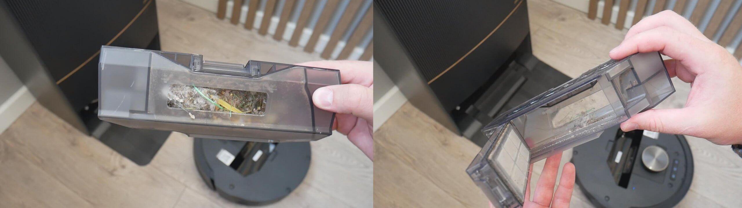 Viršutinis dangtelis yra visiškai nuimamas ir laikomas magnetais. Po juo yra 350 ml dulkių surinktuvas. Filtravimo sistemą sudaro tinklelio filtras ir HEPA filtras. Dulkių surinktuvas ir HEPA filtras yra šiek tiek modifikuoti, palyginti su „Dreame Bot X10 Pro“. Todėl šių komponentų robotai negali pakeisti. Dulkių surinktuvą ir filtrą galima plauti vandeniu. Vandens bakas yra paslėptas roboto viduje ir automatiškai užpildomas vandeniu stotelėje. Bako talpa yra 80 ml.