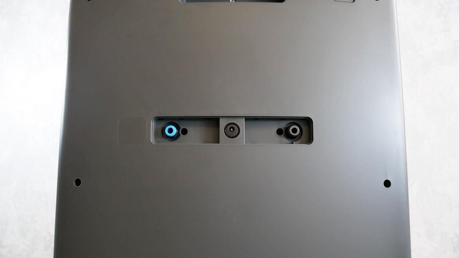 Primename, kad stotelėje yra jungiamosios detalės, skirtos prijungti prie kanalizacijos ir vandens tiekimo. Jos yra paslėptos už dangtelio. Savo „Dreame Bot X10 Pro“ apžvalgoje išsamiai aprašiau, kaip prijungti robotą prie kanalizacijos ir vandens tiekimo.