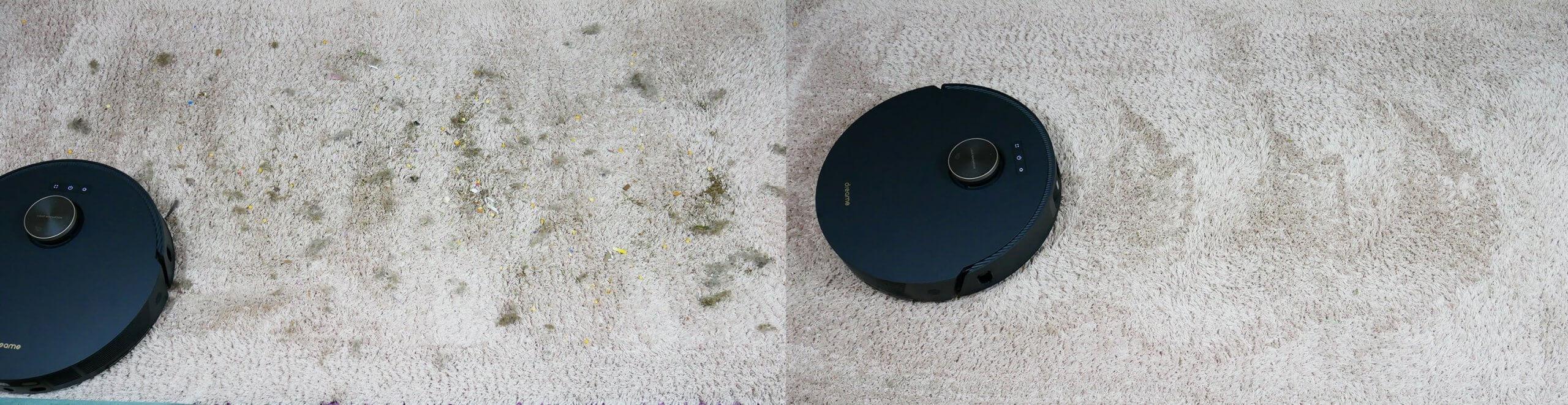 „Dreame Bot X20 Pro Plus“ puikiai valo kilimus. Dėl didelio galingumo, plaukiojančio turbo šepečio modulio ir šerelių-žiedlapių šepečio jis labai gerai valo kilimus.