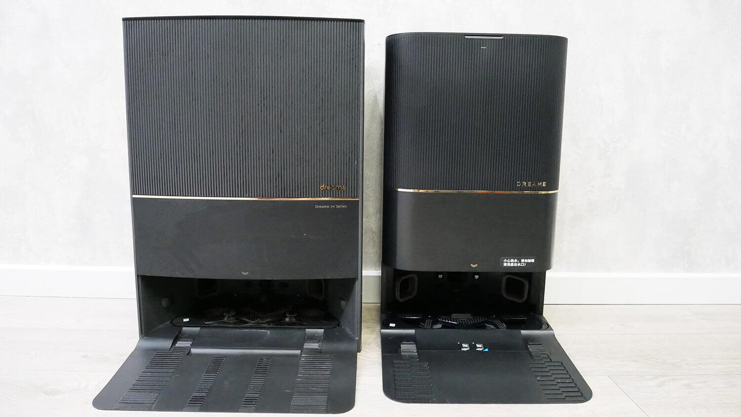 Daugelį žmonių „Dreame Bot X30 Pro“ traukia būtent dėl jo stotelės, palyginti su „X10/X20 Pro“ ar „L20/L30 Ultra“. Pakeistas jo dizainas ir matmenys. Jis siauresnis, šiek tiek mažesnis aukščio ir gylio atžvilgiu. Dydžio skirtumą galite pamatyti patys: