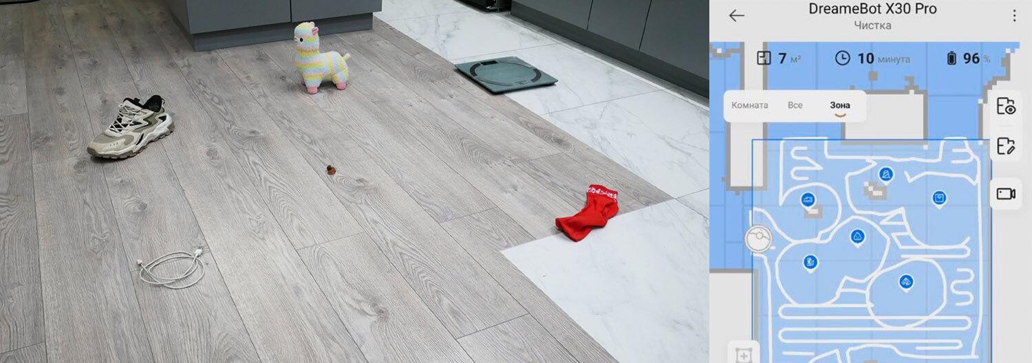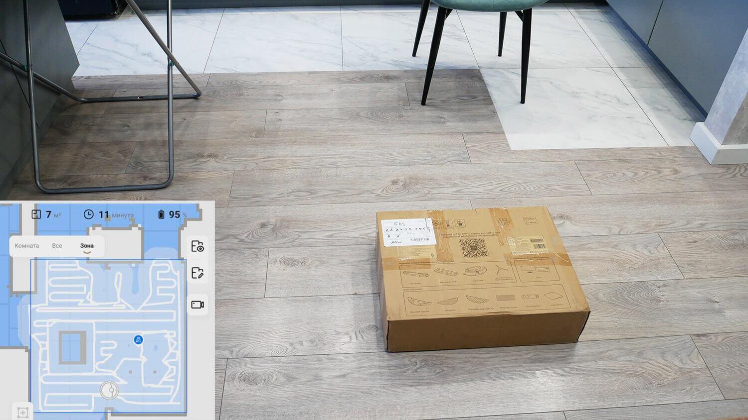 Galiausiai pereikime prie bandymų. Pirmiausia išbandysime „Dreame Bot X30 Pro“ navigaciją kambaryje su kliūtimis. Robotas dulkių siurblys pirmiausia juda aplink kambario perimetrą, tada išvalo visą prieinamą plotą gyvatės formos trajektorija. Jis aptiko džiovyklės kojeles ir atsargiai jas apėjo. Taip pat atskirai apvalė dėžę ir kėdžių kojas, prieš grįždamas į stotelę. Bandymas buvo sėkmingas.