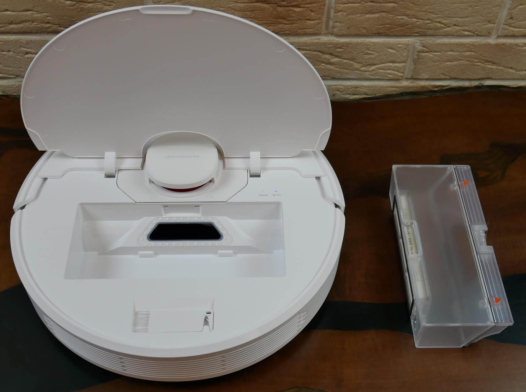 Dulkių surinktuvas yra po viršutiniu dangteliu. Taip pat yra „Wi-Fi“ ryšio indikatorius ir „Wi-Fi“ nustatymo iš naujo mygtukas. Centrinio šepečio ir dulkių surinktuvo valymo įrankis patogiai laikomas šalia surinktuvo.
