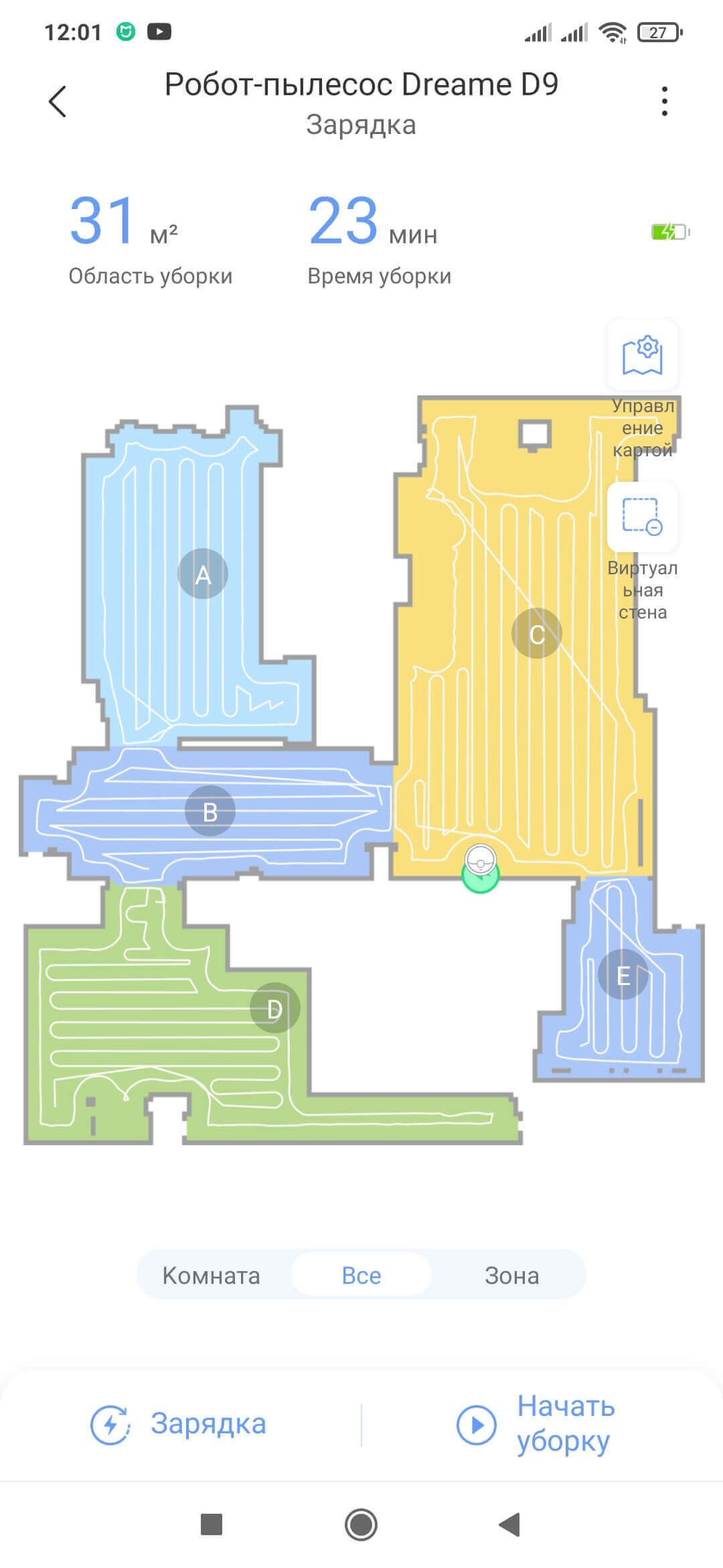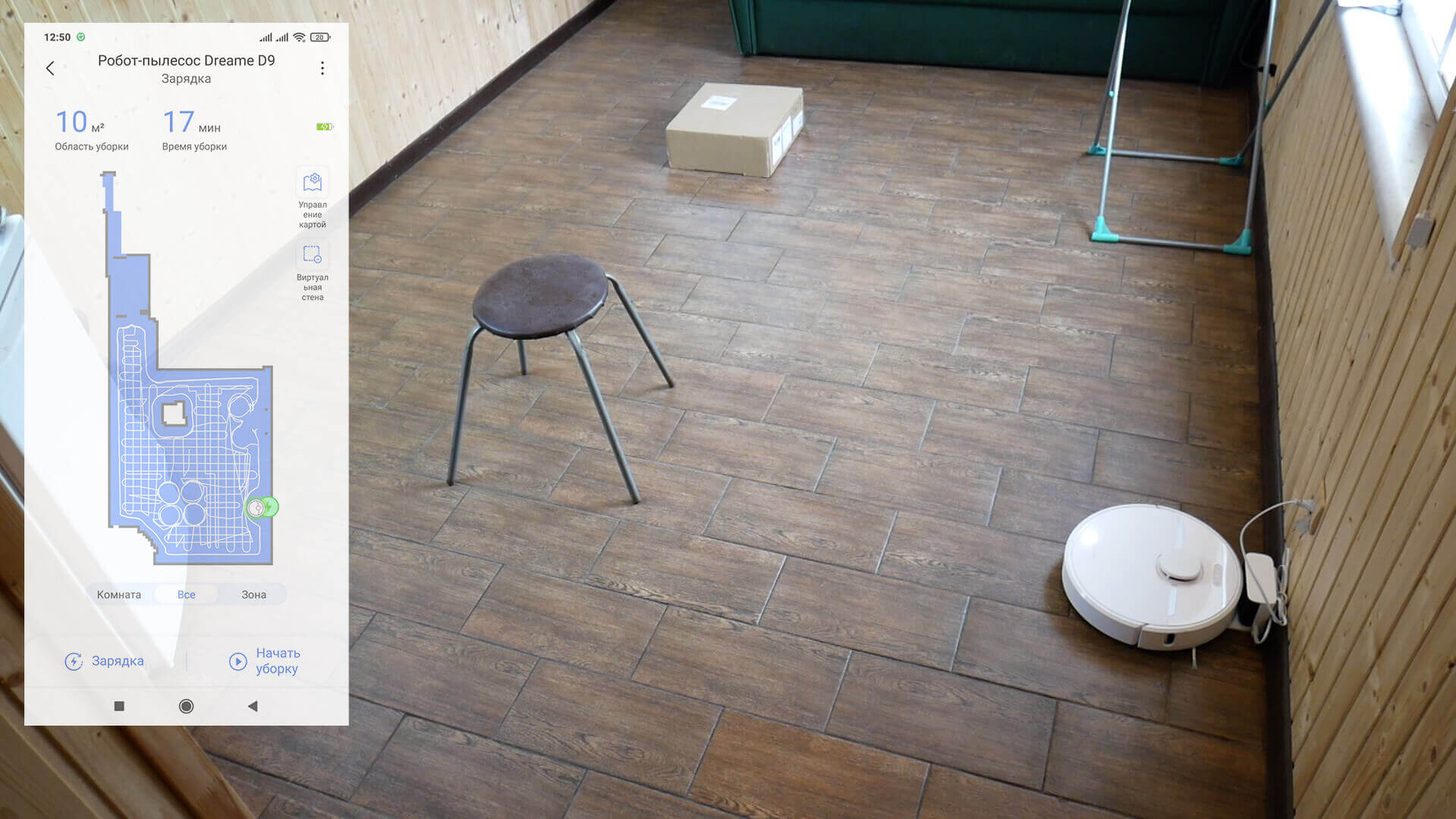 Pereikime prie bandymų. Pirmiausia patikrinsime „Dreame D9“ navigaciją kambaryje su kliūtimis. Pirmiausia robotas dulkių siurblys zigzago raštu kerta visą prieinamą plotą. Jam buvo sunku naršyti aplink džiovyklės kojas, bet jis neužstrigo ir tęsė valymo ciklą. Apėjęs perimetrą, robotas pradėjo valyti visą prieinamą plotą zigzago raštu. Jis išvalė aplink visas kėdžių kojas ir aplink dėžę, o tai yra teigiamas dalykas. Po to „Dreame D9“ vėl kirto perimetrą ir pradėjo valyti zigzago raštu, statmenu pradiniam praėjimui. Šis dvigubas praėjimas pagerina valymo kokybę. Baigęs antrąjį praėjimą, robotas grįžo į savo bazę. Bandymas buvo sėkmingas, ir nėra jokių nusiskundimų dėl navigacijos sudėtingomis sąlygomis.