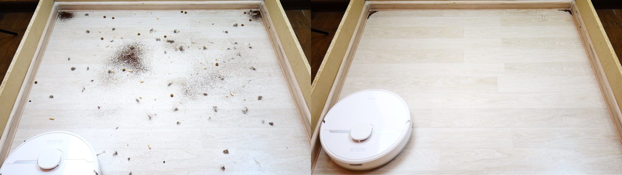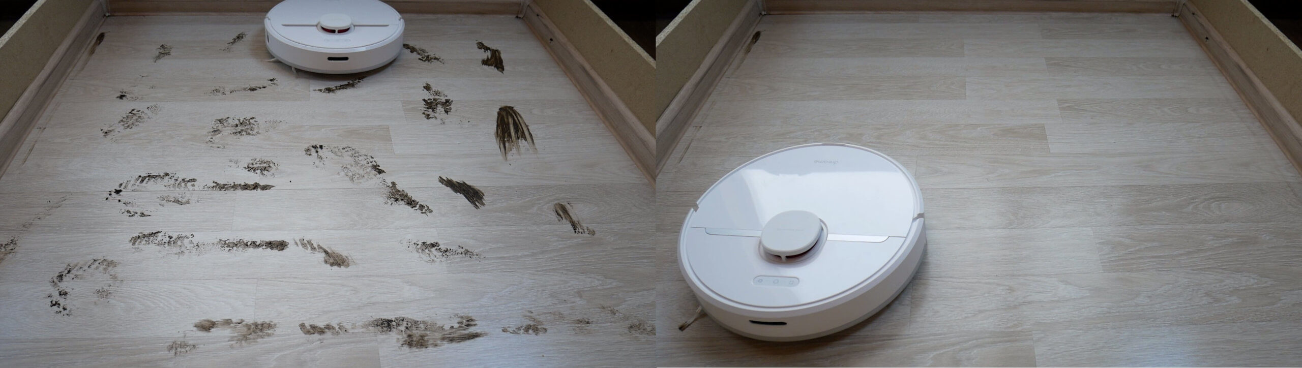 Šlapias valymas taip pat pasirodė esąs nepriekaištingas. Robotas dulkių siurblys sugebėjo pašalinti šiek tiek išdžiūvusius nešvarumus nuo laminuotų grindų, palikdamas tik nedidelį ruoželį palei grindjuostę, kuri yra probleminė vieta ir kituose mūsų išbandytuose modeliuose.