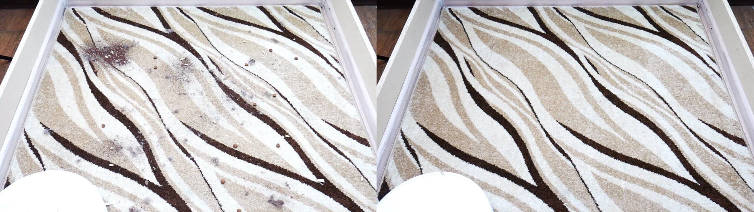 Tos pačios šiukšlės buvo išbarstytos ant kilimo, o „Dreame D9“ jas išvalė be jokių problemų. Kilimų valymo našumas taip pat yra labai aukštas.