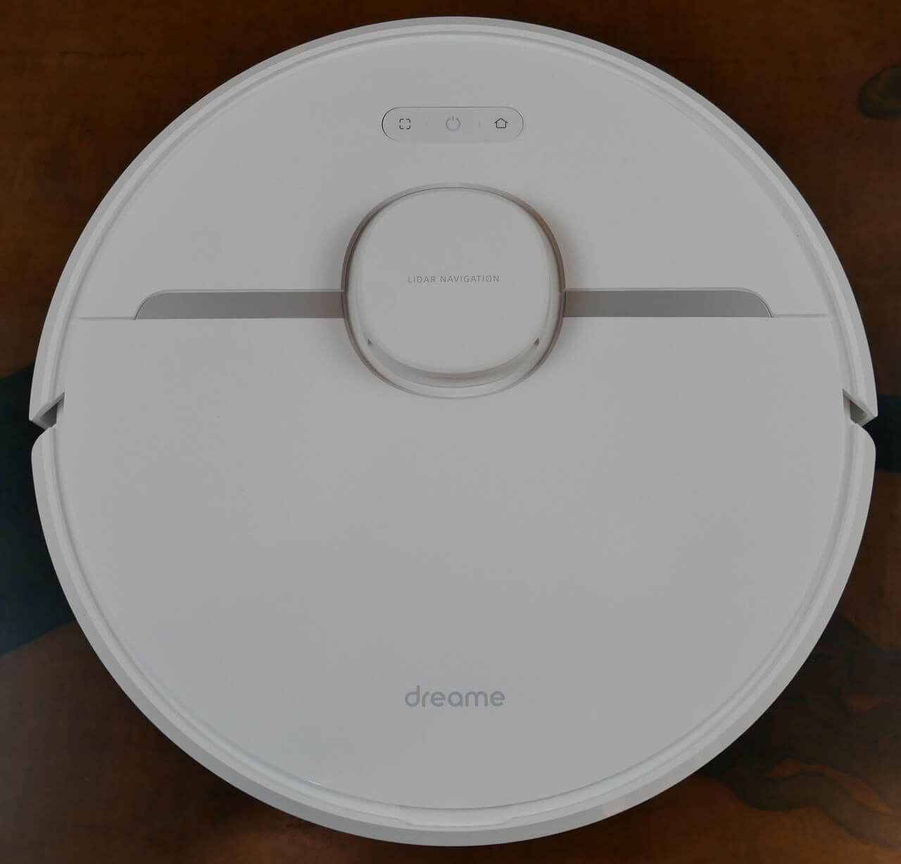 Dabar pažvelkime į patį robotą dulkių siurblį. „Dreame D9“ yra baltos spalvos ir pagamintas iš aukštos kokybės plastiko. Jo apvalus korpusas turi minkštą mechaninį priekinį buferį, kurio šone yra sienos jutiklis, o priekyje – kliūčių aptikimo jutiklis, leidžiantis robotui švelniau liesti aplinkinius objektus.