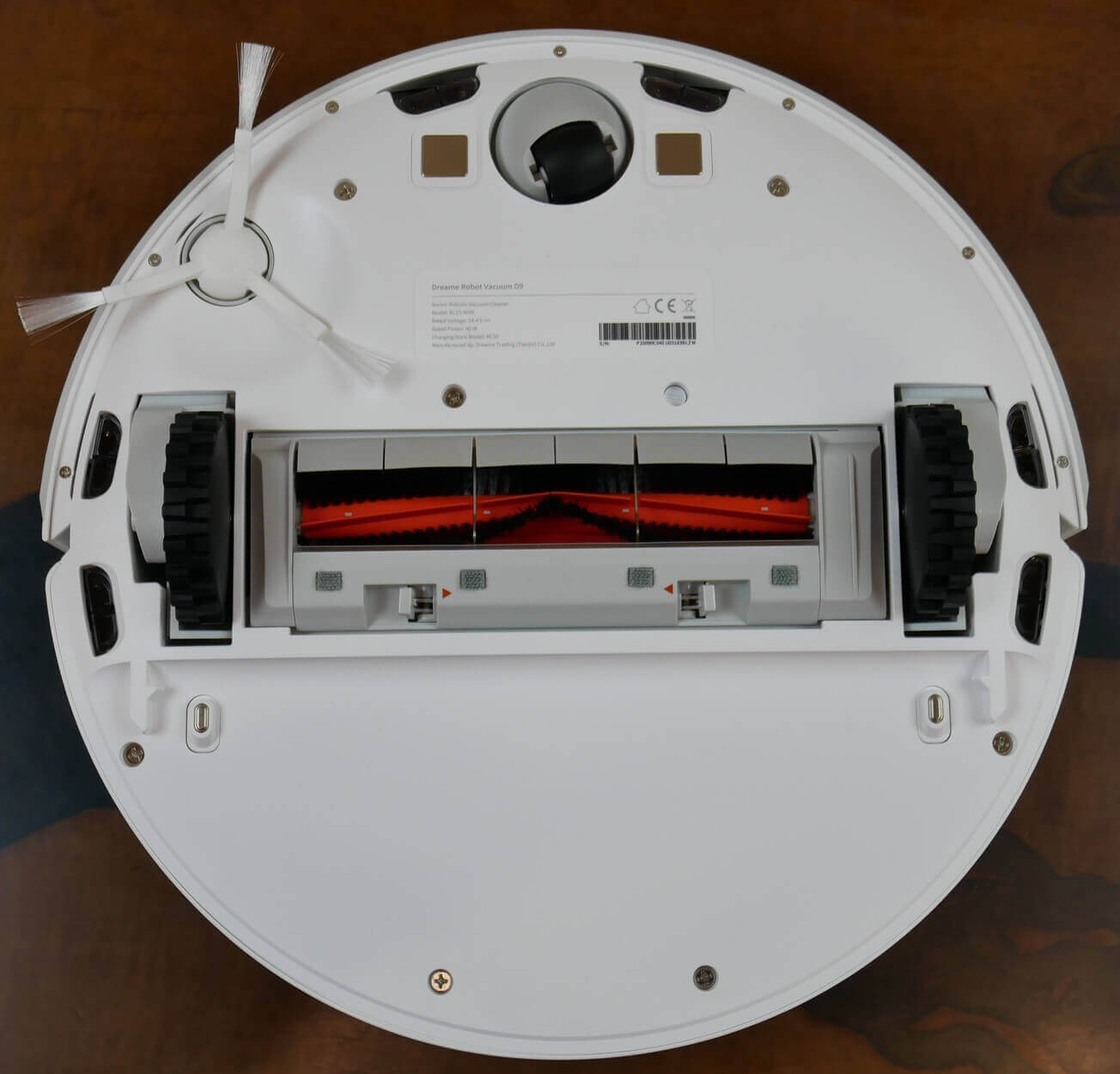Pažvelkime į roboto dizainą iš apačios. Matome šešis apsaugos nuo kritimo jutiklius. Šoninis šepetys yra trijų dalių ir greitai atleidžiamas. Centrinį turbošepetį su šereliais ir žiedlapiais galima nuimti iš abiejų pusių, kad būtų pašalinti susivėlę plaukai ir naminių gyvūnėlių plaukai. Tai yra privalumas.