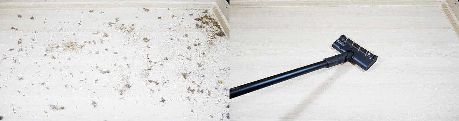 Dabar patikrinkime, kaip gerai „Dreame R10 Pro“ surenka grindų šiukšles. Ant laminuotų grindų išbarsčiau įvairių rūšių šiukšles: plaukus, kailį, grūdus ir kitas smulkias buitines šiukšles. Šis prietaisas veikė gerai. Svarbu pažymėti, kad jis be vargo surenka šiukšles palei grindjuostes ir kampuose. Jis kruopščiai surenka viską. Minkštų šerelių volelis vos surenka plaukus ar pūkelius. Visos šiukšlės surenkamos į dulkių konteinerį.