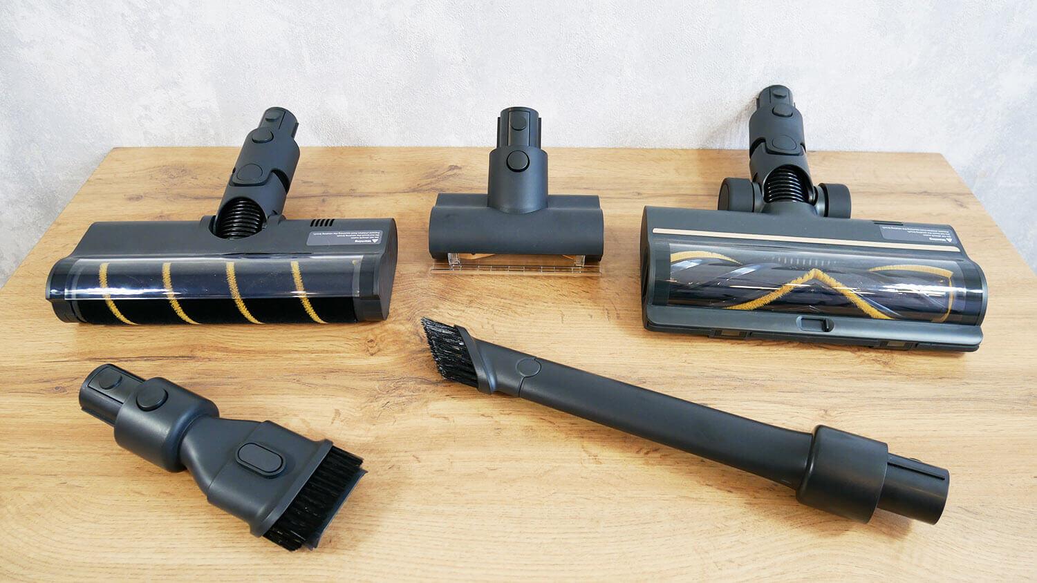 - Pilnas priedų rinkinys, įskaitant du skirtingos konstrukcijos volelius skirtingoms grindų dangoms.