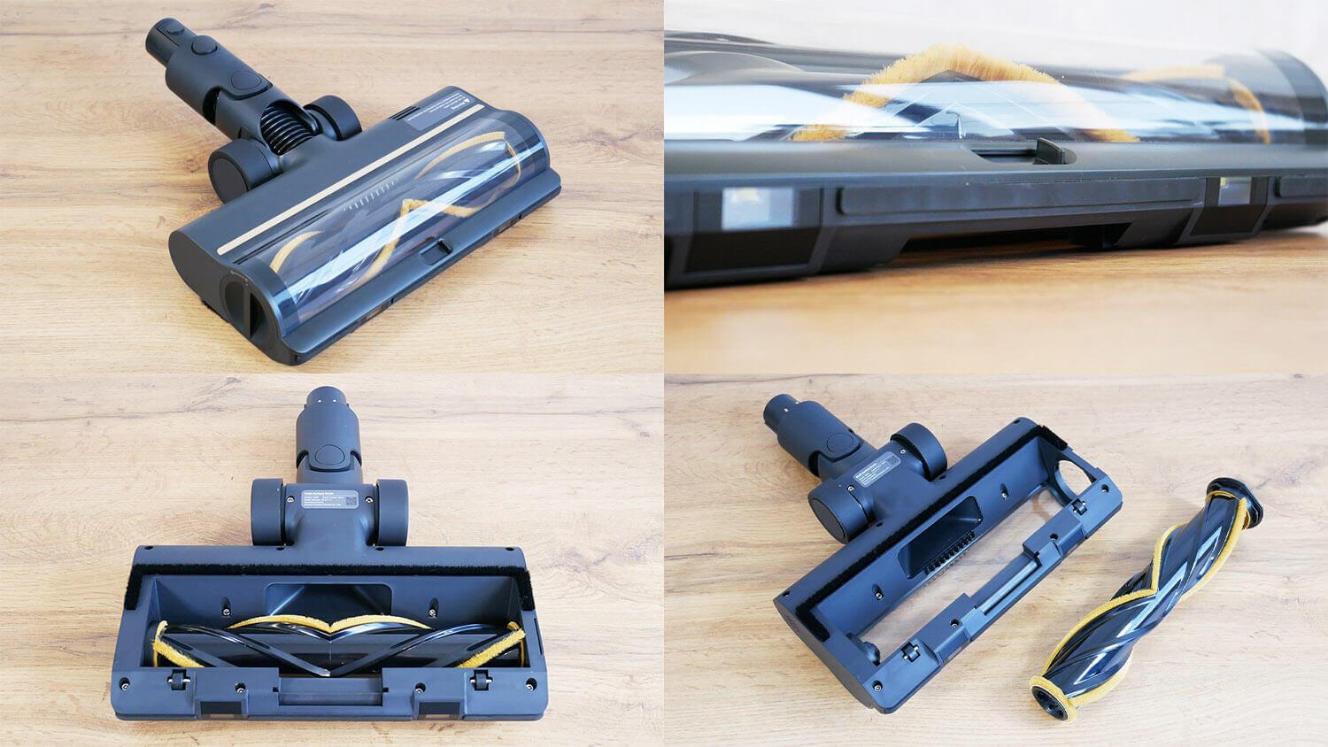 Pereikime prie pridedamų priedų apžvalgos. Pagrindinis priedas yra praktiškai identiškas tam, kuris pridedamas prie „Dreame R20“. Jame yra priekinis apšvietimas ir jungiklis, kuris pakelia ritininį užraktą, kad būtų surinktos didesnės šiukšlės. Pats volelis turi trumpus, standžius šerelius, kurie geriau tinka kilimams valyti. Volelio užraktą lengva nuimti ranka, o už volelio yra šukos plaukams ir naminių gyvūnėlių plaukams iššukuoti. Pats priedas skiriasi tik foninio apšvietimo spalva. „Dreame R20“ yra mėlynos spalvos, o „R10 Pro“ – baltos.