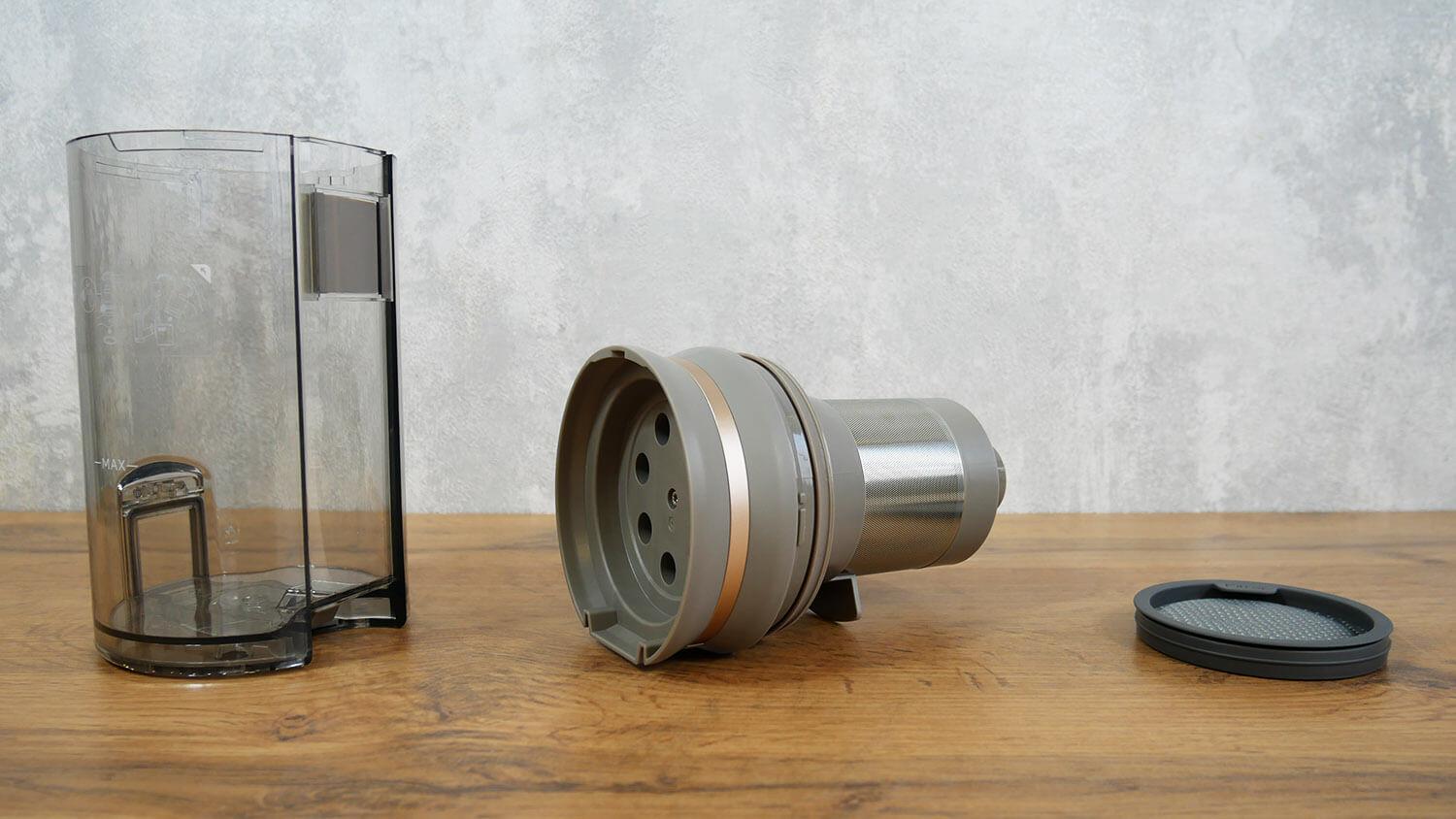 Jei reikia, dulkių konteinerį galite išvalyti ir rankiniu būdu. Norėdami tai padaryti, nuimkite jį nuo pagrindinio įrenginio, išimkite filtravimo sistemą ir tiesiog iškratykite šiukšles. Labai patogu. Jei reikia, konteinerį ir visą filtravimo sistemą galite išskalauti vandeniu. Tik prieš dėdami atgal į dulkių siurblį, įsitikinkite, kad viskas yra visiškai sausa.