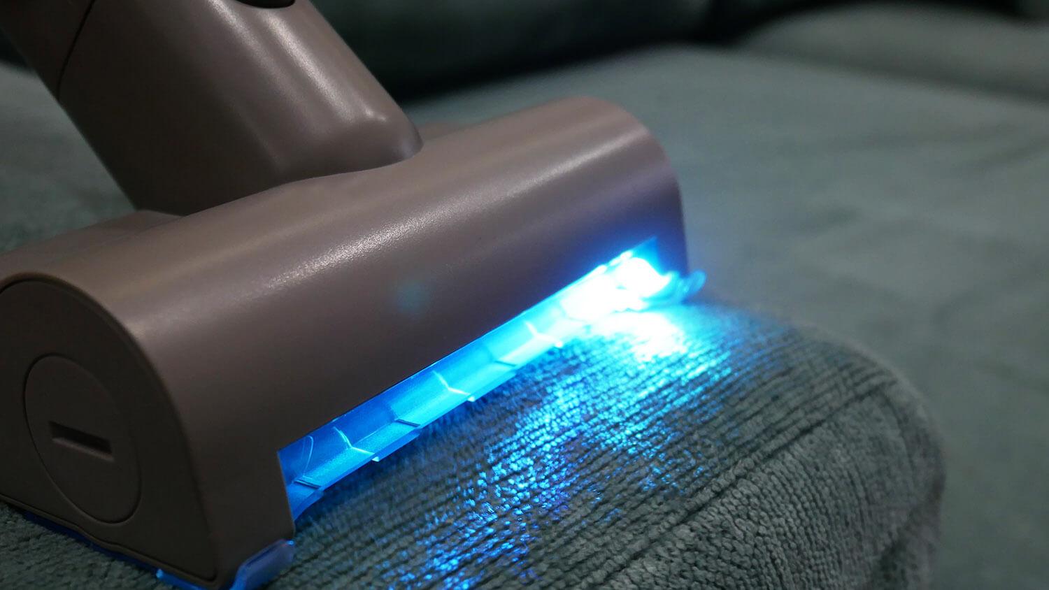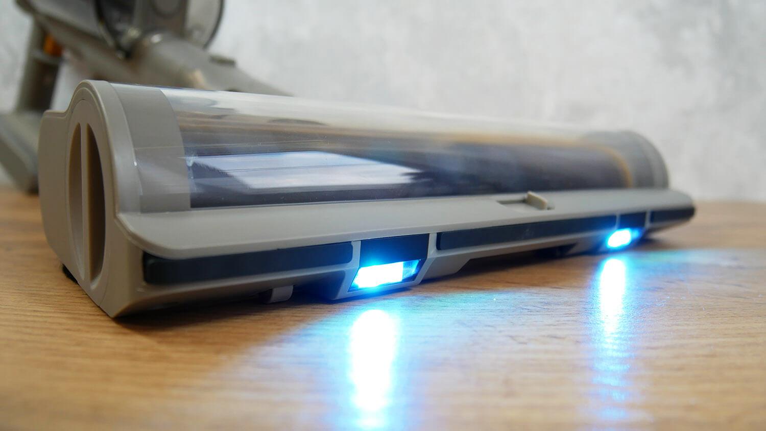 Prietaiso priekis yra apšviestas, kad būtų paryškinta valymo zona. Sutinku su naudotojais, kad būtų logiškiau šią lemputę įmontuoti į pūkinio volelio antgalį. Sprendimas nėra aiškus.