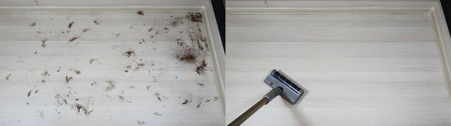 Dabar patikrinkime, kaip gerai „Dreame Z10“ stotelė surenka grindų šiukšles. Ant laminuotų grindų išbarsčiau įvairių rūšių šiukšles: plaukus, kailį, grūdus ir kitas smulkias buitines šiukšles. Šis prietaisas veikė gerai. Svarbu pažymėti, kad jis be problemų surenka šiukšles palei grindjuostes ir kampuose. Jis kruopščiai surenka viską. Į volelį neįstringa plaukai ar kailis. Dalis plaukų patenka už volelio šerelių įdėklo. Tačiau didžioji dalis šiukšlių patenka į dulkių konteinerį.