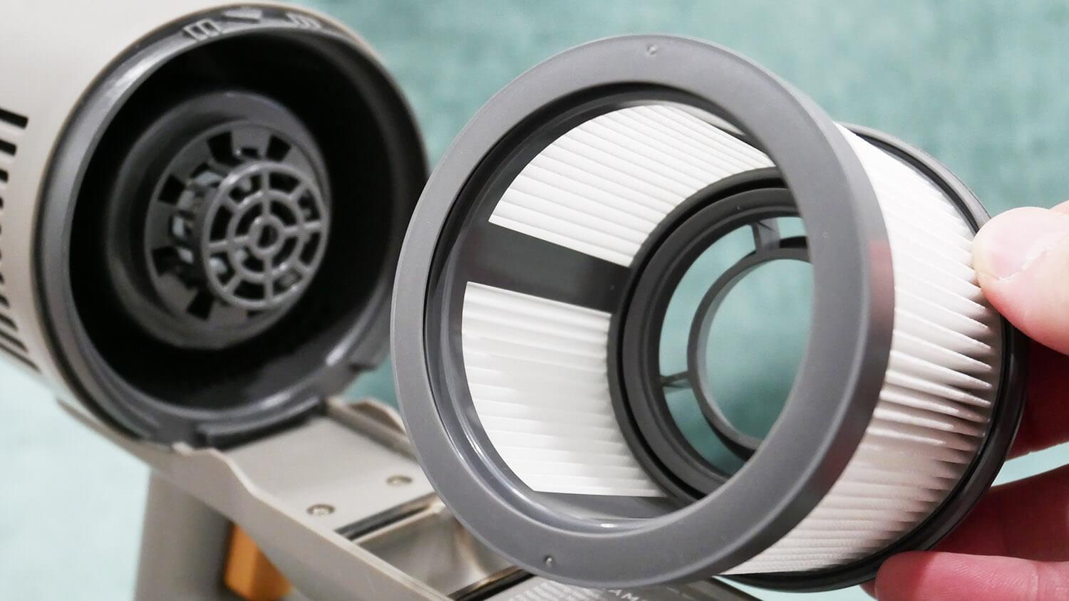 Dulkių surinkimo talpykla taip pat yra nuimama, todėl ją lengva valyti. Talpykloje yra savaime išsivalanti užuolaida. Pačios dulkių surinkimo talpyklos talpa yra maždaug 500 ml. Filtravimo sistemą sudaro audinio filtras, ciklonas su tinkleliu ir priešvariklinis HEPA filtras, kuris yra įmontuotas dulkių siurblio korpuse.