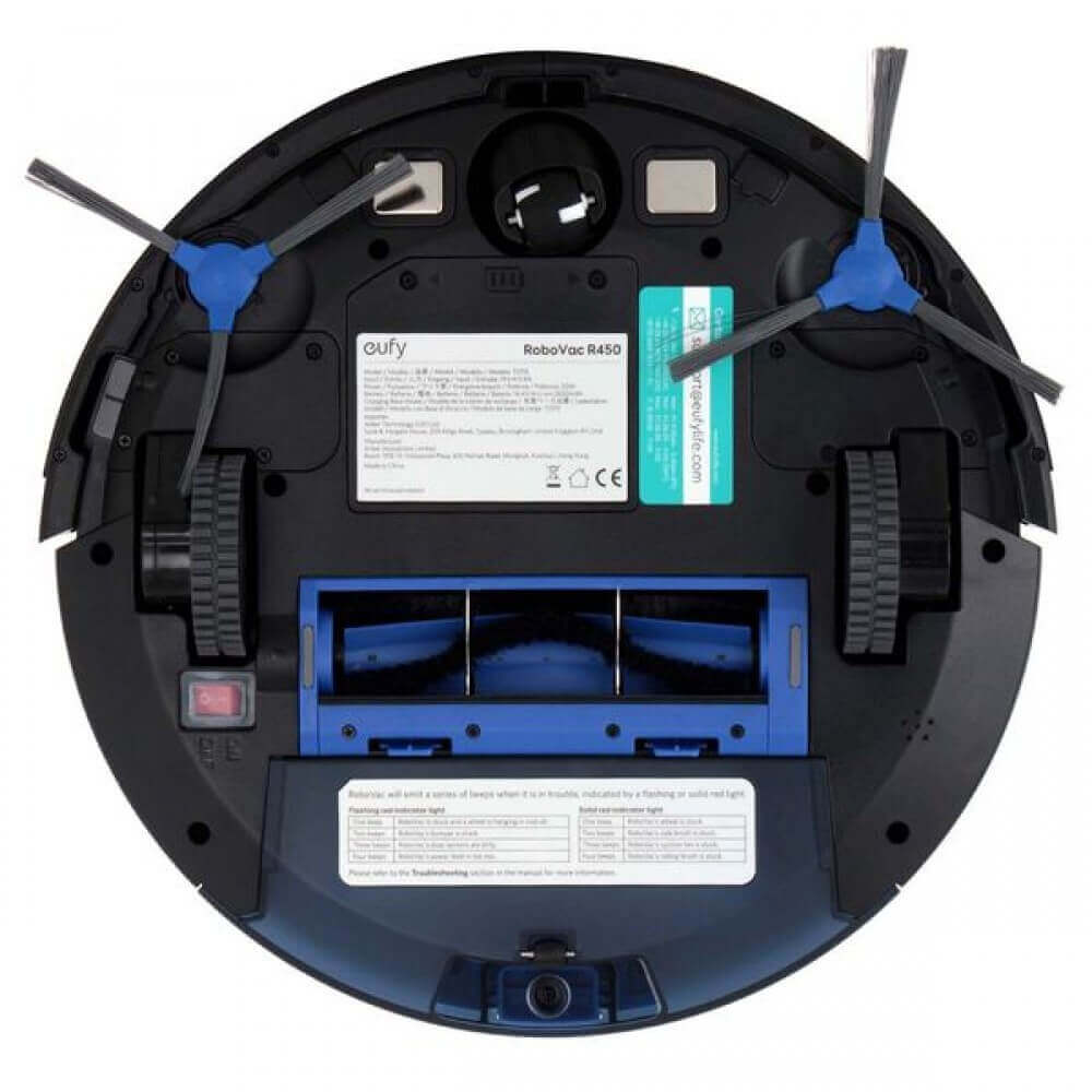„Eufy RoboVac R450“ robotinio dulkių siurblio gale yra pasukamas ratas ir du protezuoti varomieji ratai, leidžiantys įrenginiui ne tik judėti, bet ir lipti bei peržengti iki 20 milimetrų aukščio slenksčius. Netoliese yra apvalūs šepetėliai ir pora kontaktinių padėklų automatiniam įkrovimui. Netoli centro yra V formos turbo šepetys. Netoliese yra pagrindinis maitinimo jungiklis, apsaugotas nuo drėgmės ir dulkių.