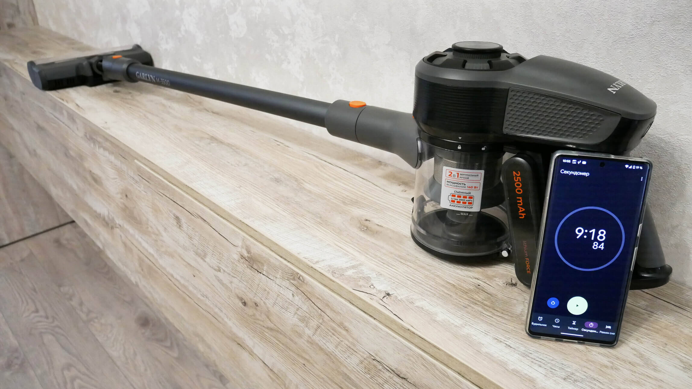Galiausiai pereikime prie bandymų. Pirmiausia patikrinkime „GARLYN M-3500“ veikimo laiką maksimaliu galingumu. Dulkių siurbliui pavyko veikti 9 minutes ir 18 sekundžių turbo režimu. Net ilgiau nei teigia gamintojas. Veikimo laikas yra gana standartinis.