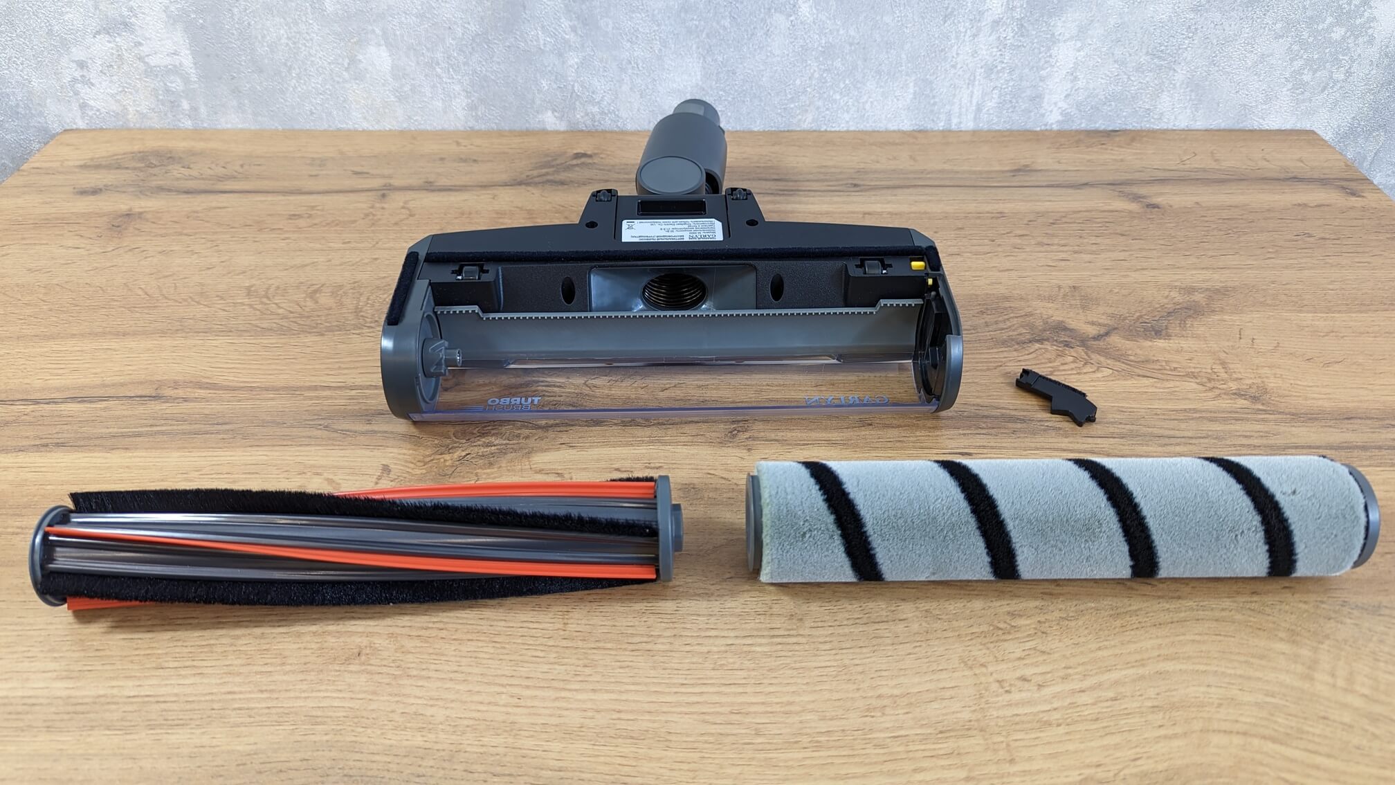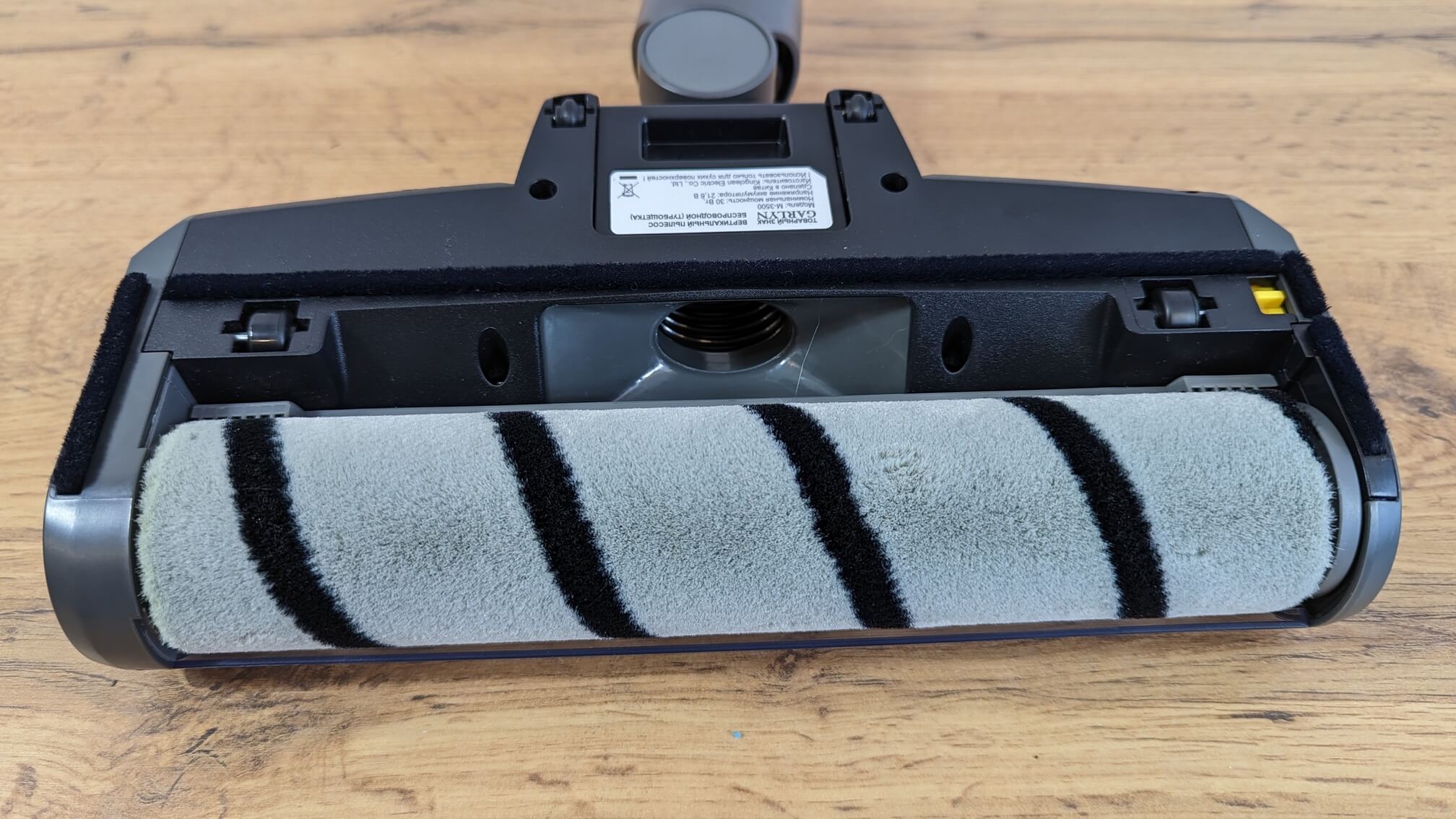 Dabar pažvelkime į pagrindinį grindų antgalį. Jis turi pasukamą jungtį. Antgalis komplektuojamas su puriu voleliu, skirtu kietoms grindims valyti. Už jo yra didelė siurbimo anga, leidžianti surinkti net dideles šiukšles. Volelį galima nuimti be jokių įrankių – tiesiog užfiksuokite mechaninį fiksatorių. Dar viena išmani funkcija – šukos už volelio, skirtos plaukams ir kailiui iššukuoti. Tai privalumas.