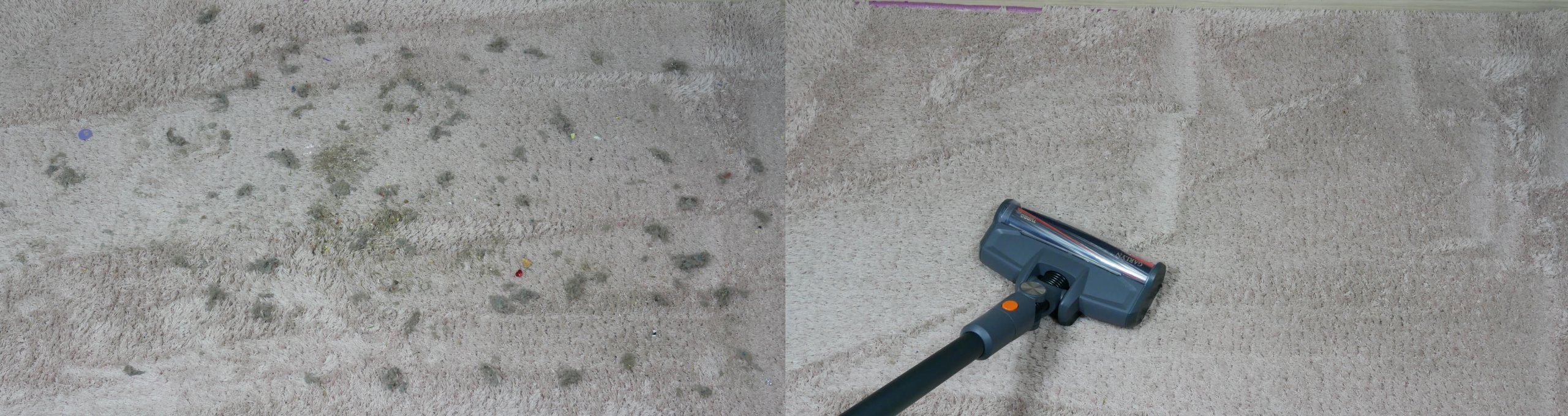 Tos pačios šiukšlės buvo išbarstytos ant kilimo, ir dulkių siurblys atliko tokį pat gerą darbą, kruopščiai jį išvalydamas. Kilimui valyti buvo sumontuotas antras, atvartuotas ir šerelių volelis, kuris taip pat nesurinko jokių kailių ar plaukų. Dar vienas bandymas svarbus!