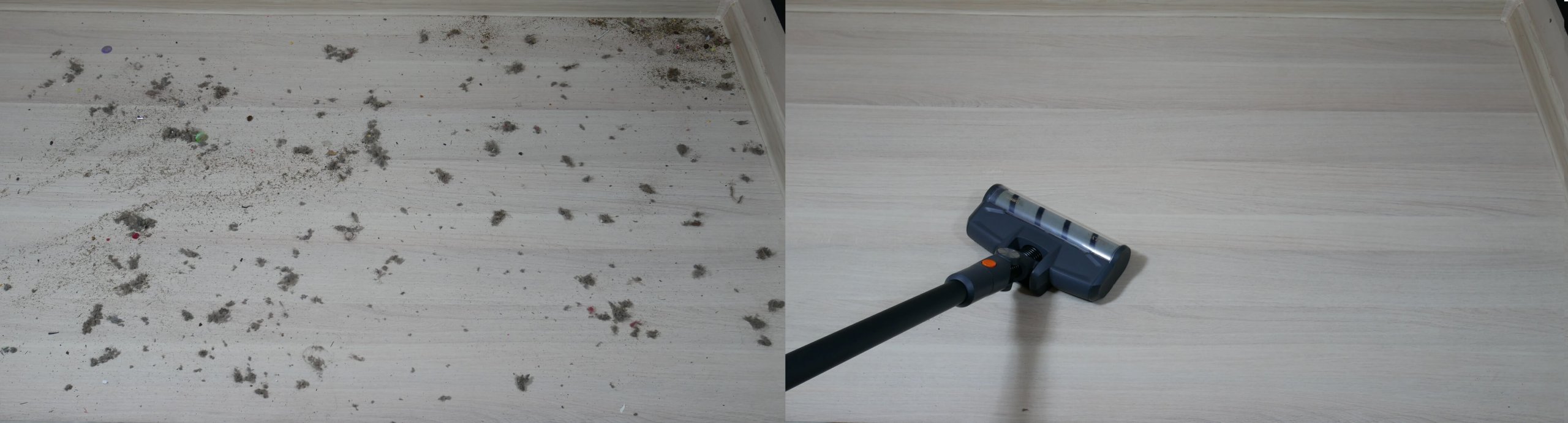 Dabar patikrinkime, kaip gerai GARLYN M-3500 surenka grindų šiukšles. Ant laminuotų grindų išbarsčiau įvairių rūšių šiukšles: plaukus, kailį, grūdus ir kitas smulkias buitines šiukšles. Ši mašina veikė gerai. Svarbu pažymėti, kad ji be vargo surenka šiukšles palei grindjuostes ir kampuose. Ji kruopščiai surenka viską, nepalikdama aklųjų zonų. Pūkuotas volelis vos surenka plaukus ar kailį. Testas išlaikytas!