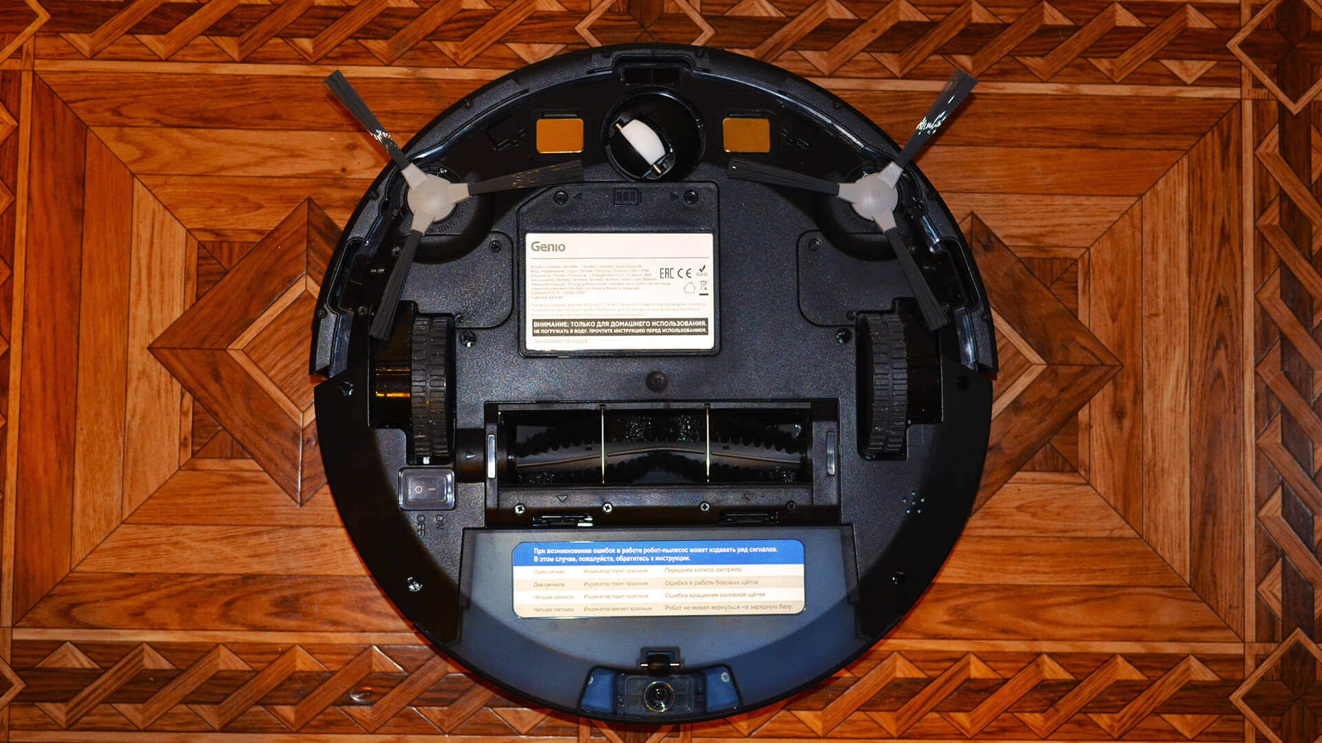 Apvertus robotą dulkių siurblį, matomas centrinis šerelių formos šepetys, du šoniniai šepečiai, ratukai, pasukamas volelis, įkrovimo kontaktai ir įjungimo/išjungimo mygtukas. Prie roboto apačios taip pat galima pritvirtinti mikropluošto šluostę drėgnam valymui ar grindims plauti.