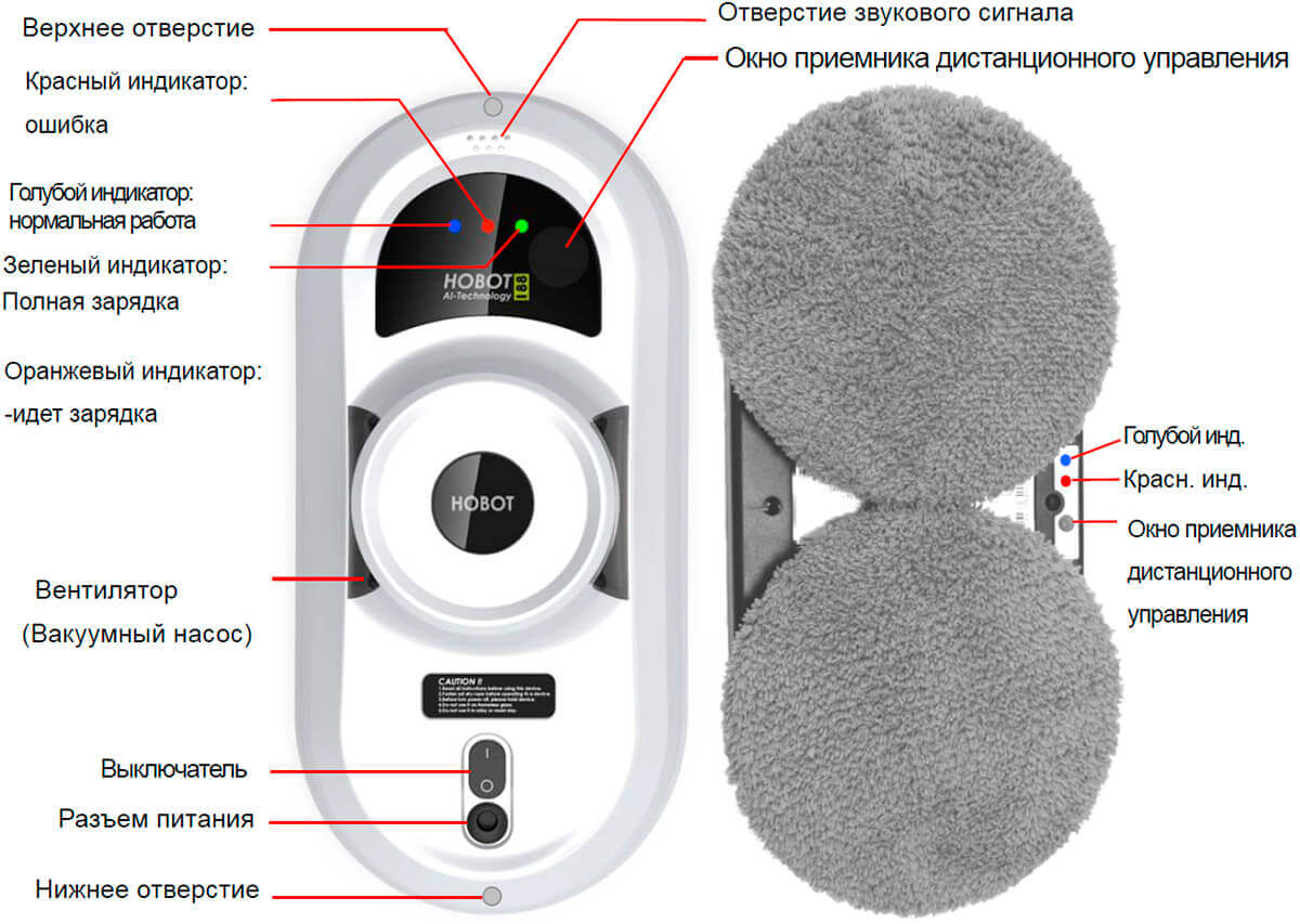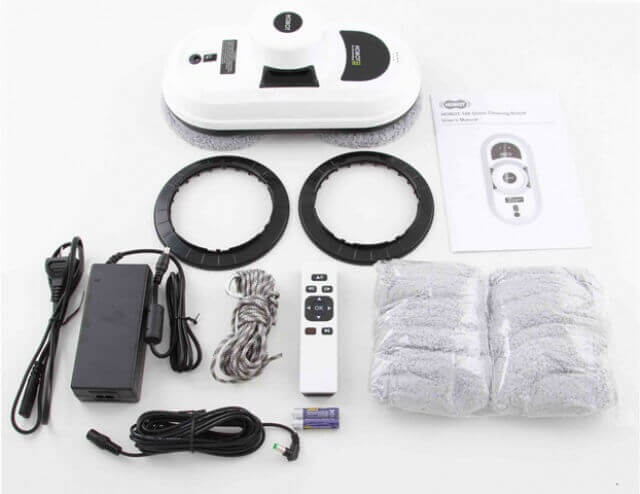 Pažvelgus į langų valymo roboto apačią, matyti du diskai, kuriuose po valymo laikomos minkštos, plaunamos mikropluošto šluostės. Juose taip pat yra dvigubos indikatoriaus lemputės ir nuotolinio valdymo imtuvas. Tai būtina norint valdyti robotą valant lango išorę.