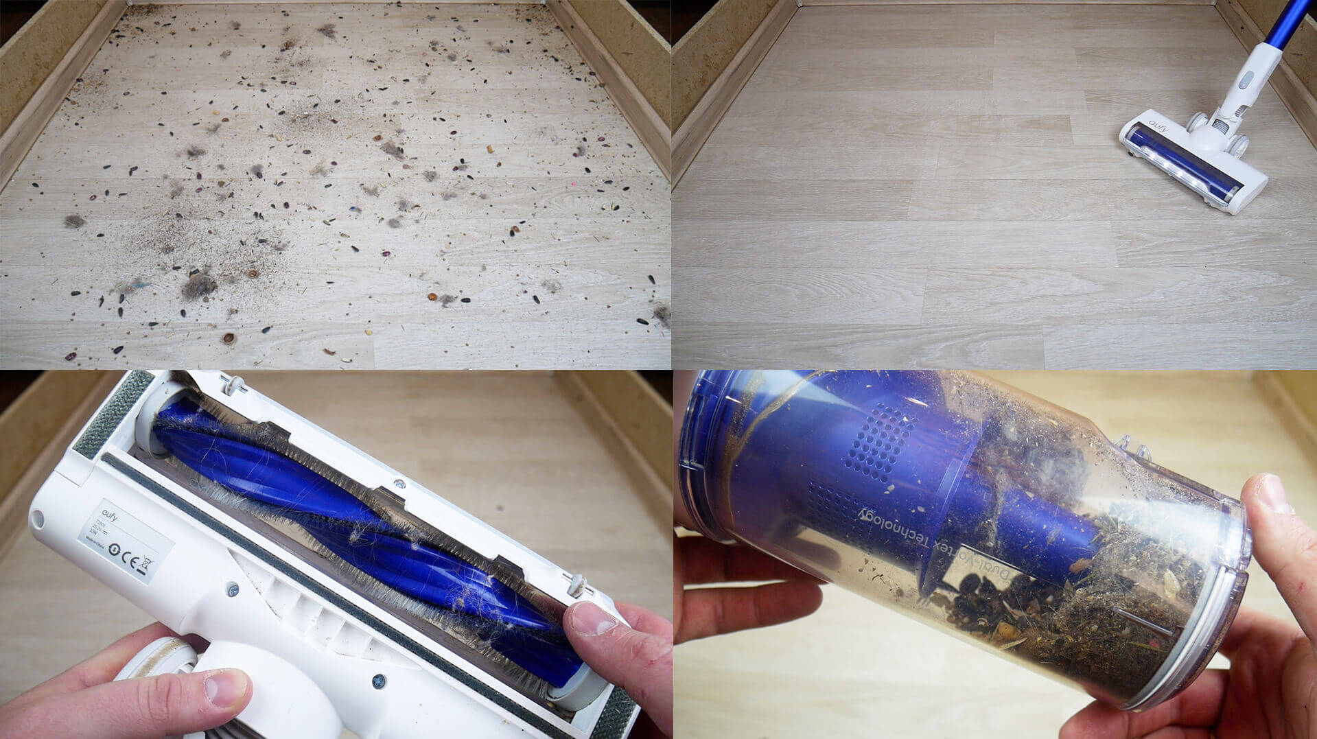 Dulkių siurblys gerai surenka įvairias šiukšles nuo laminuotų grindų. Jis nepalieka šiukšlių palei sienas ar kampuose. Nėra aklųjų zonų, o tai yra privalumas. Matome, kad šepetys sugeria visą smūgį ir suvyniojo plaukus. Visos kitos šiukšlės surenkamos dulkių konteineryje.