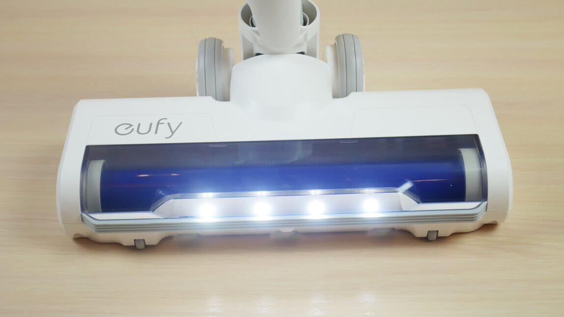 Pažvelkime atidžiau į pagrindinį grindų antgalį. Norėčiau iš karto atkreipti dėmesį, kad voleliai yra guminiai, todėl siurbiant nesibraižo grindų. Tai yra privalumas. Priekinis LED apšvietimas padeda aptikti nešvarumus prastai apšviestose vietose.
