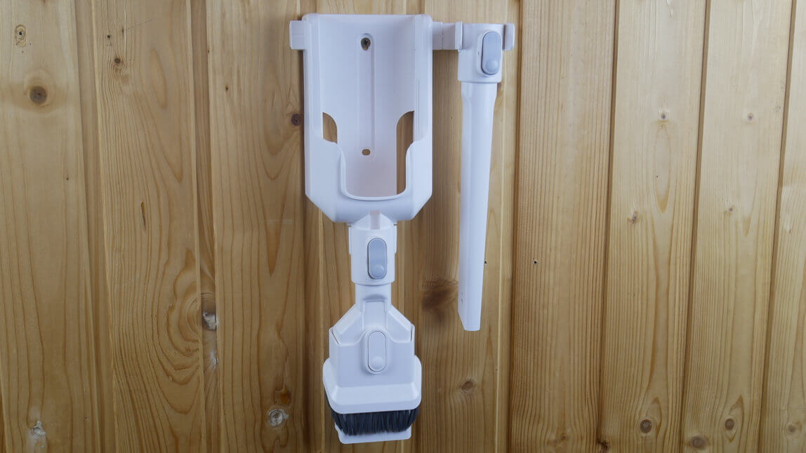 - Prie sienos tvirtinamas dulkių siurblio laikiklis ir vienas iš priedų.