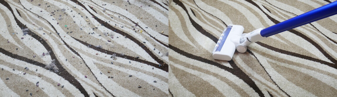 Tos pačios šiukšlės buvo išbarstytos ant kilimo, o „HomeVac S11 Reach“ labai kruopščiai išvalė kilimą, nepalikdamas jokių šiukšlių pėdsakų.