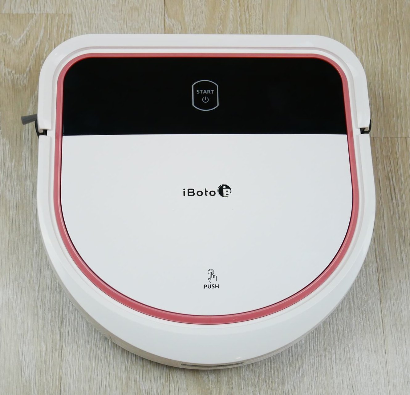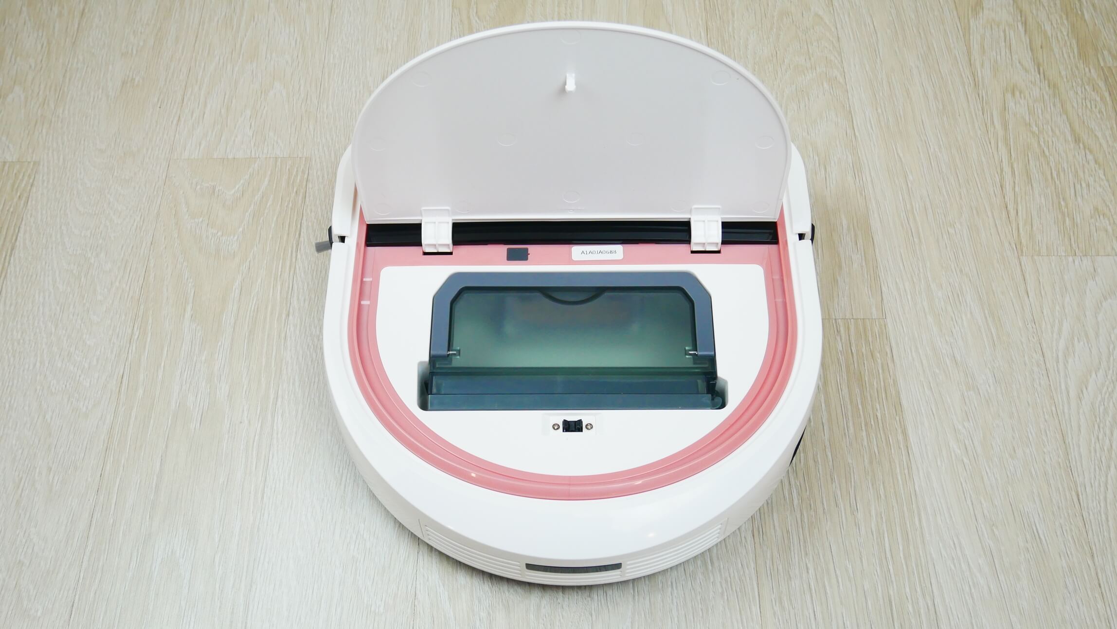 Dabar atidžiau panagrinėkime, kaip veikia šis robotas dulkių siurblys. Priekyje sumontuotas minkštas mechaninis buferis. Korpuso viršuje yra vienas paleidimo/pauzės mygtukas. Taip pat matome švelniai rožinį rėmelį, kuris stilingai atrodo derinamas su balta ir juoda spalvomis. Šis robotas dulkių siurblys tikrai būtų puiki dovana mergaitei. Beje, jis yra tik 7,5 cm aukščio.
