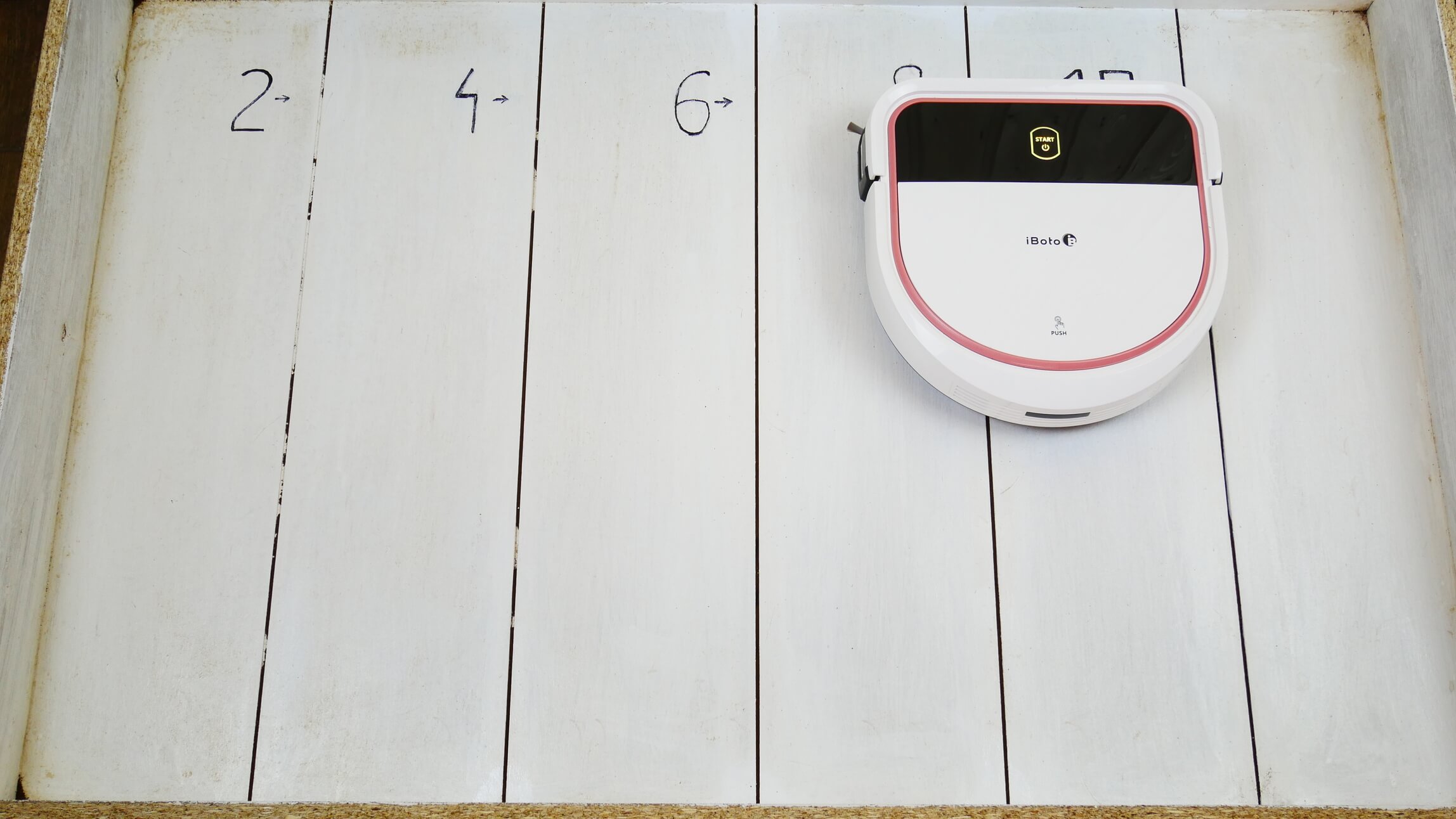 Pereikime prie bandymų. Pirmiausia patikrinsime, kaip „iBoto Smart N520GT Aqua“ naviguoja viename kambaryje su kliūtimis.
