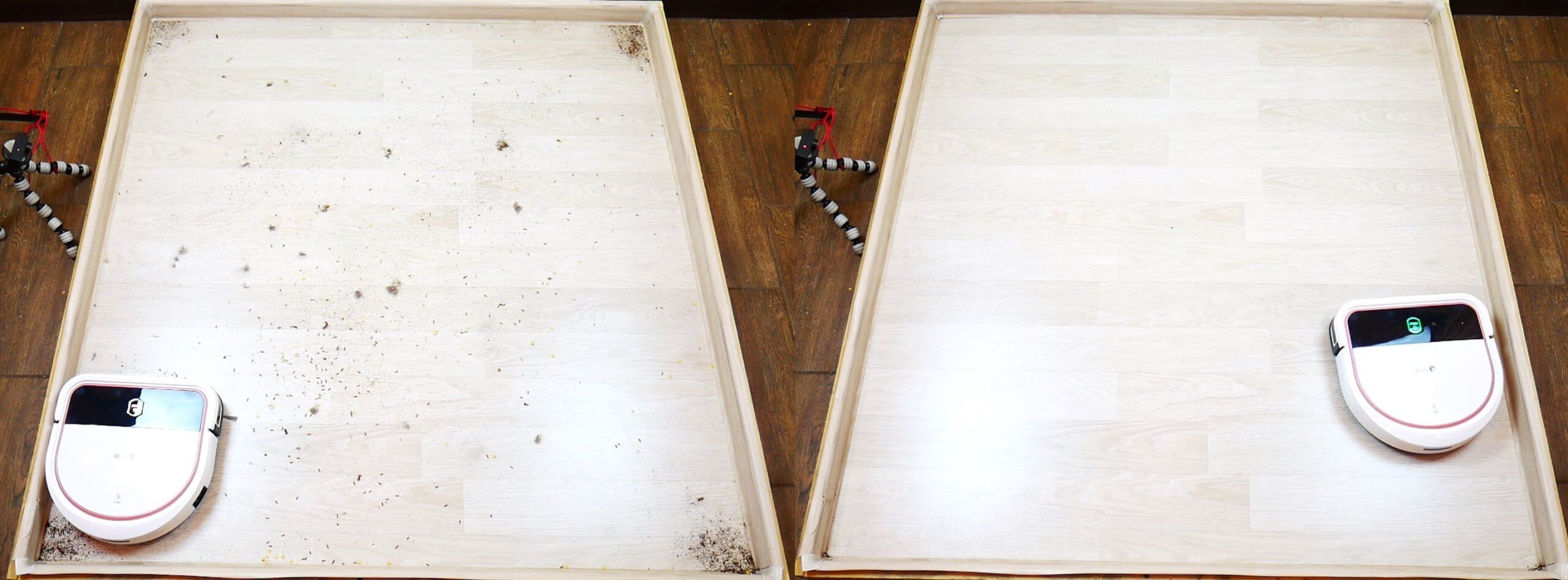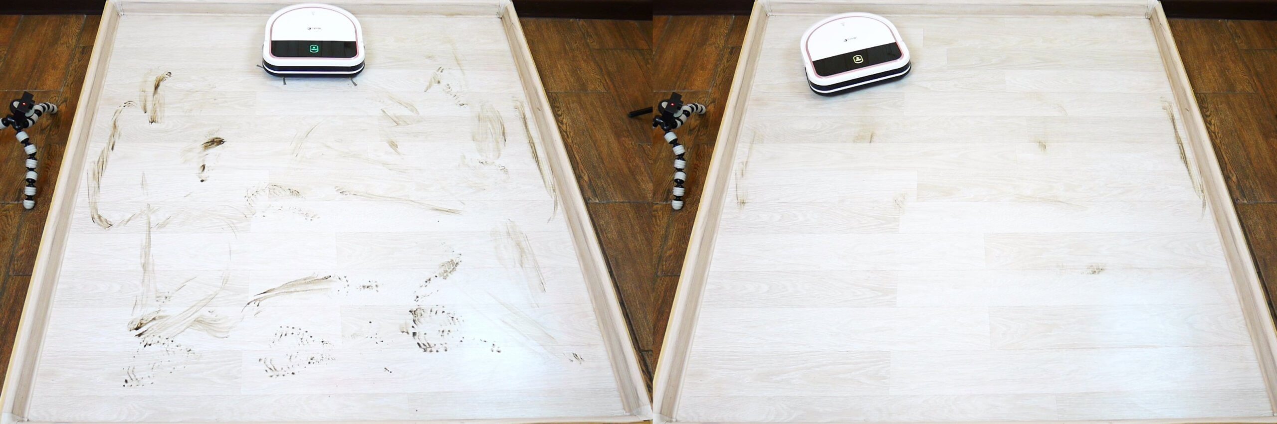 Dabar patikrinkime, ar robotas gali pašalinti pridžiūvusius nešvarumus nuo laminuotų grindų. Dėl prasto šluostės sudrėkinimo ir silpno spaudimo antgaliui „iBoto Smart N520GT Aqua“ negali visiškai pašalinti sunkių nešvarumų. Tačiau jis pašalino šiek tiek nešvarumų nuo paviršiaus.