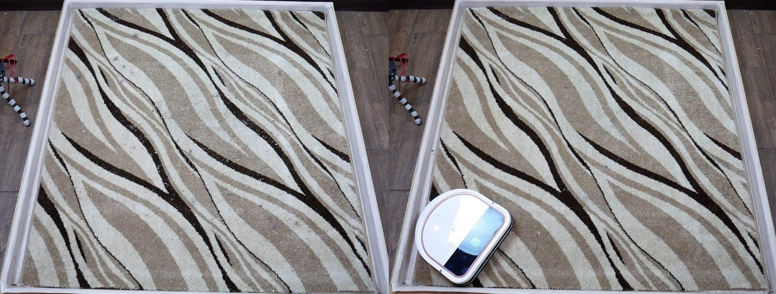 Tos pačios šiukšlės buvo išbarstytos ant kilimo. Kilimų valymo efektyvumas buvo prastesnis. Taip yra dėl centrinio šepečio, kuris geriau surenka šiukšles nuo kilimo, trūkumo. Tačiau „iBoto Smart N520GT Aqua“ surinko didžiąją dalį šiukšlių, todėl kilimų valymo efektyvumas yra vidutinis.